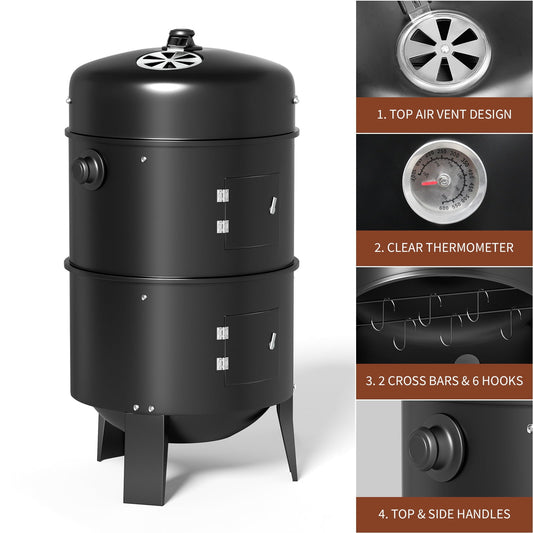 KingChii 3 in 1 Vertical Charcoal Smoker Grill BBQ Smoker for Outdoor, Patio Backyard Camping, Black