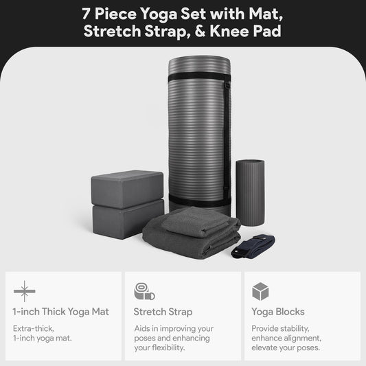 BalanceFrom Fitness 7 Piece Yoga Set with Mat, Stretch Strap & Knee Pad, Gray