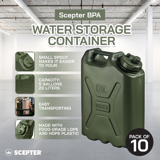 Scepter 5 Gallon Heavy Duty Military Style HDPE Water Container (10 Pack), Black