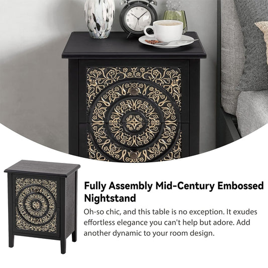 COZAYH Farmhouse 2 Drawer Home Bedroom Nightstand w/Embossed Flower Motif, Black
