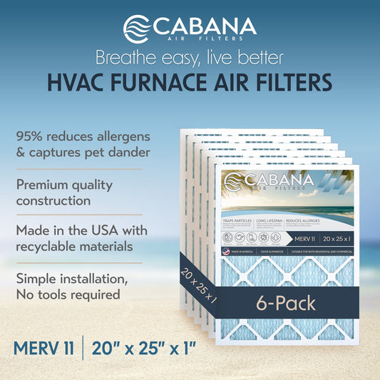 Cabana Air Filters 6 Pack HVAC Furnace Air Filters, MERV 11, 20 x 25 x 1, White