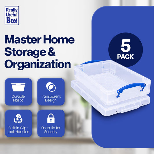 Really Useful Box 4L Storage Container with Lid and Clip Lock Handles, (5 Pack)