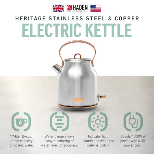 Haden Heritage 1.7 Liter Stainless Steel Electric Water Kettle, Steel & Copper