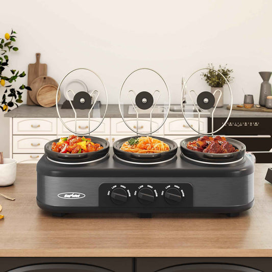 Heynemo Triple Slow Cooker, Buffet Food Warmer with three 1.5-Quart Removable Ceramic Pots, Buffet Servers and Warmers with Glass Lids and 3 Spoons, Stainless Steel, Grey
