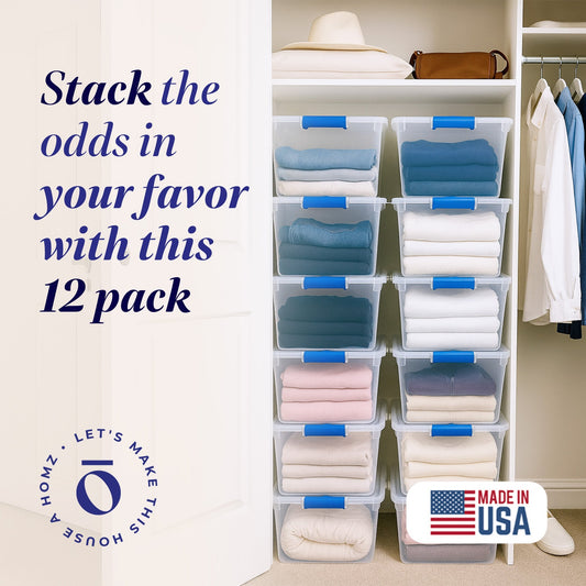 Homz 31 Quart Heavy Duty Clear Plastic Stackable Storage Containers, 12 Pack