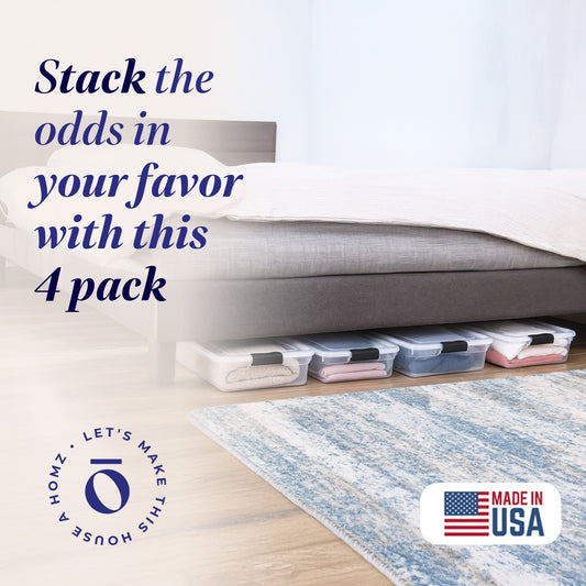 Homz 56 Qt Full/Queen Underbed Clear Plastic Latching Storage Container, 4 Pack