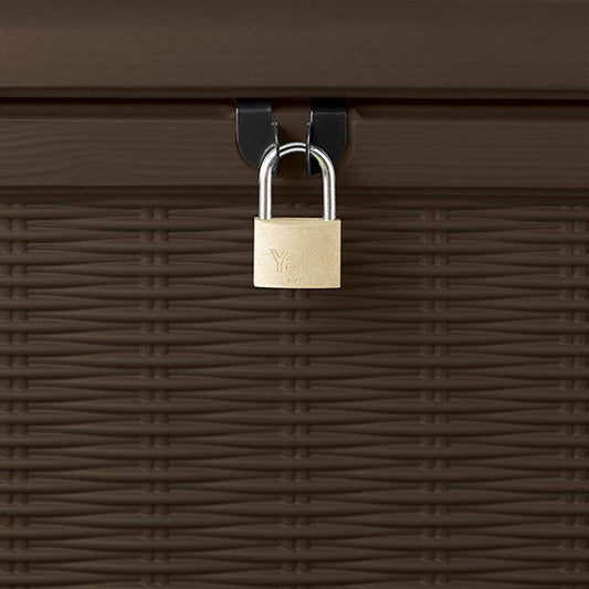Keter Borneo 110 Gallon Rattan Wicker Resin Patio Deck Storage Box Bench, Brown