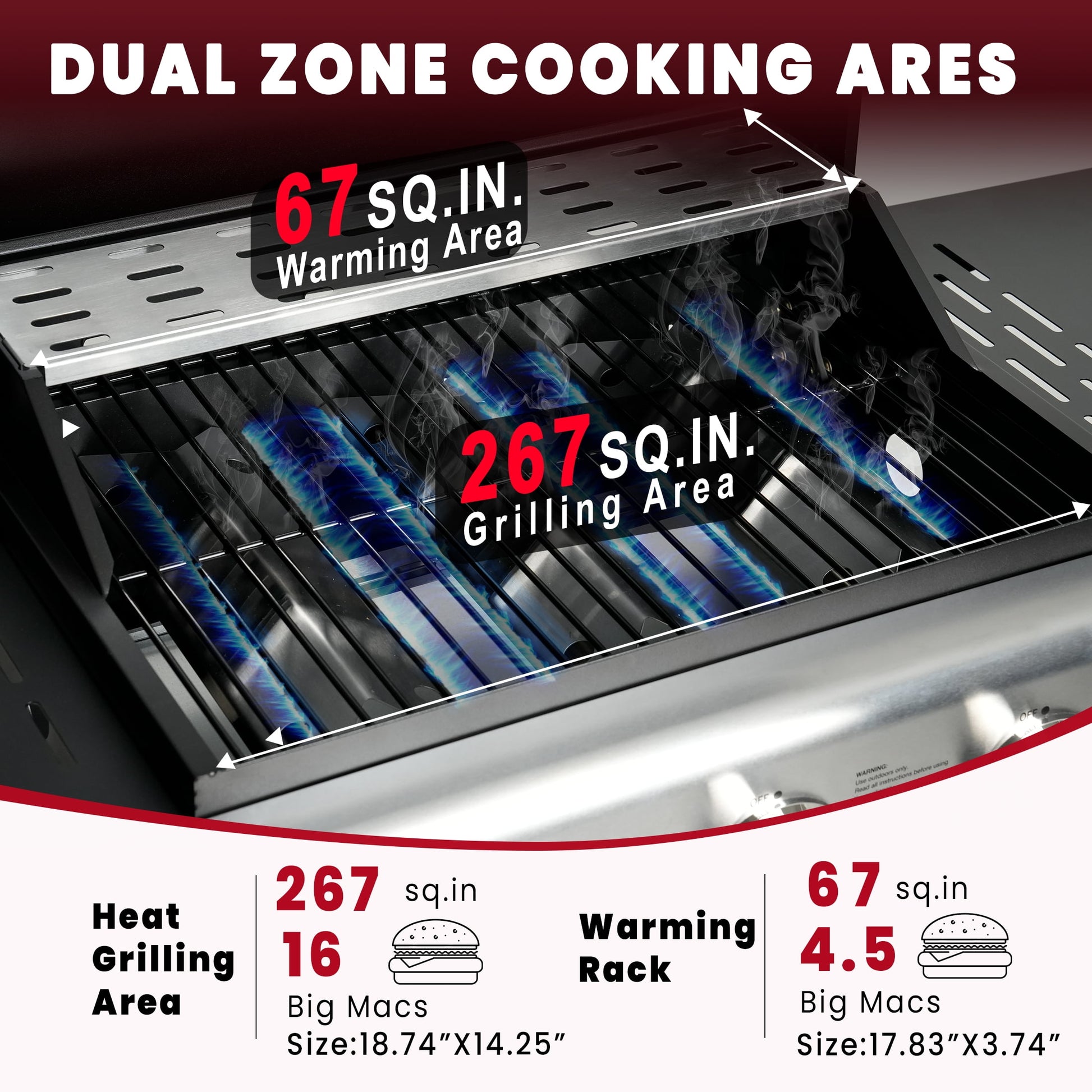 💡334 Sq.In Total Cooking Area: 267 sq.in main grill + 67 sq.in warming rack – ideal for 18+ burgers simultaneously.