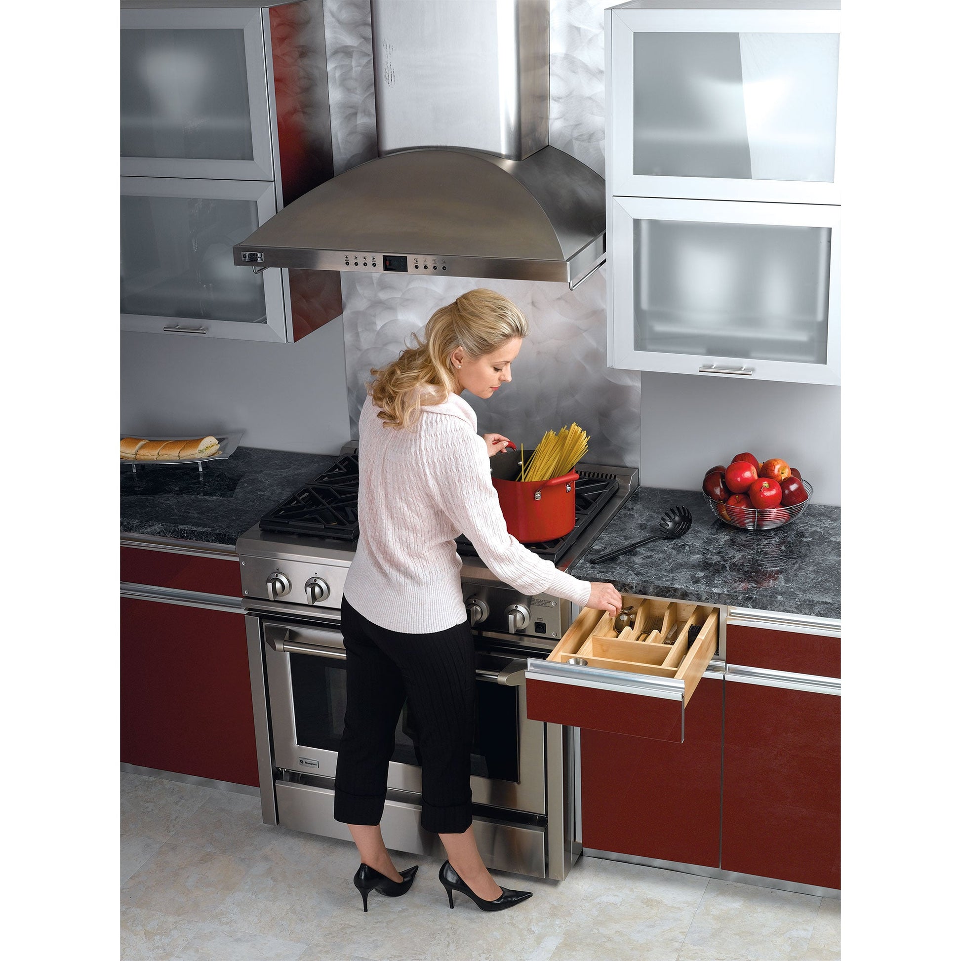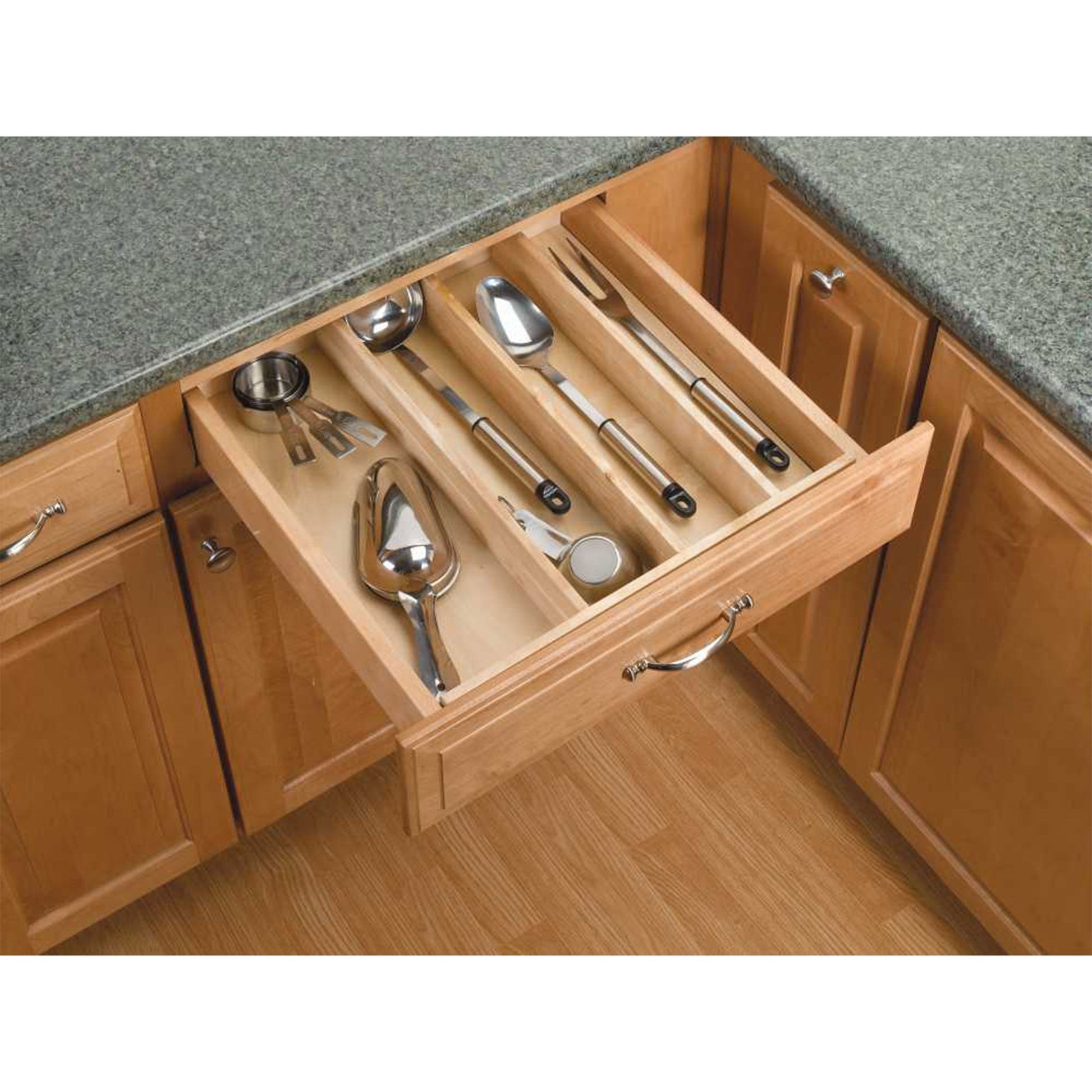 Turn your messy silverware drawer into an organized dream with this Rev-A-Shelf Wooden Kitchen Utility Drawer Insert Organizer. This tray slips into your existing kitchen drawer and instantly transforms a normal drawer into an ideal place to store all of your cutlery and utensils.