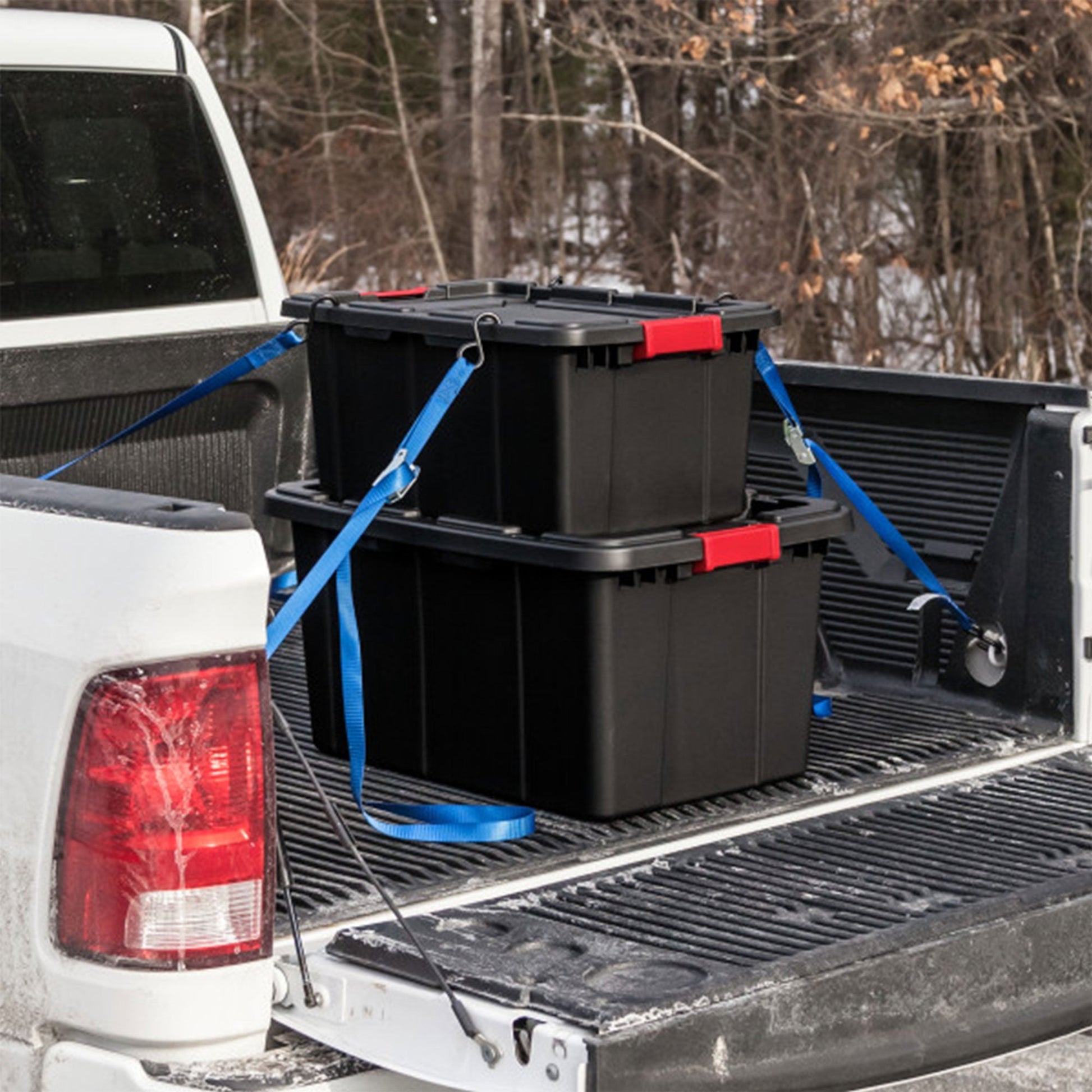 The tight-fit, drip-protected lid provides maximum protection against items getting wet. Deep recessed lids allow for secure stacking to maximize available storage space. Keyholes in the lid provide options for tie-downs to keep totes in place when transporting and storing. The rugged black totes feature an exciting red latch that helps you easily identify where to open the totes.