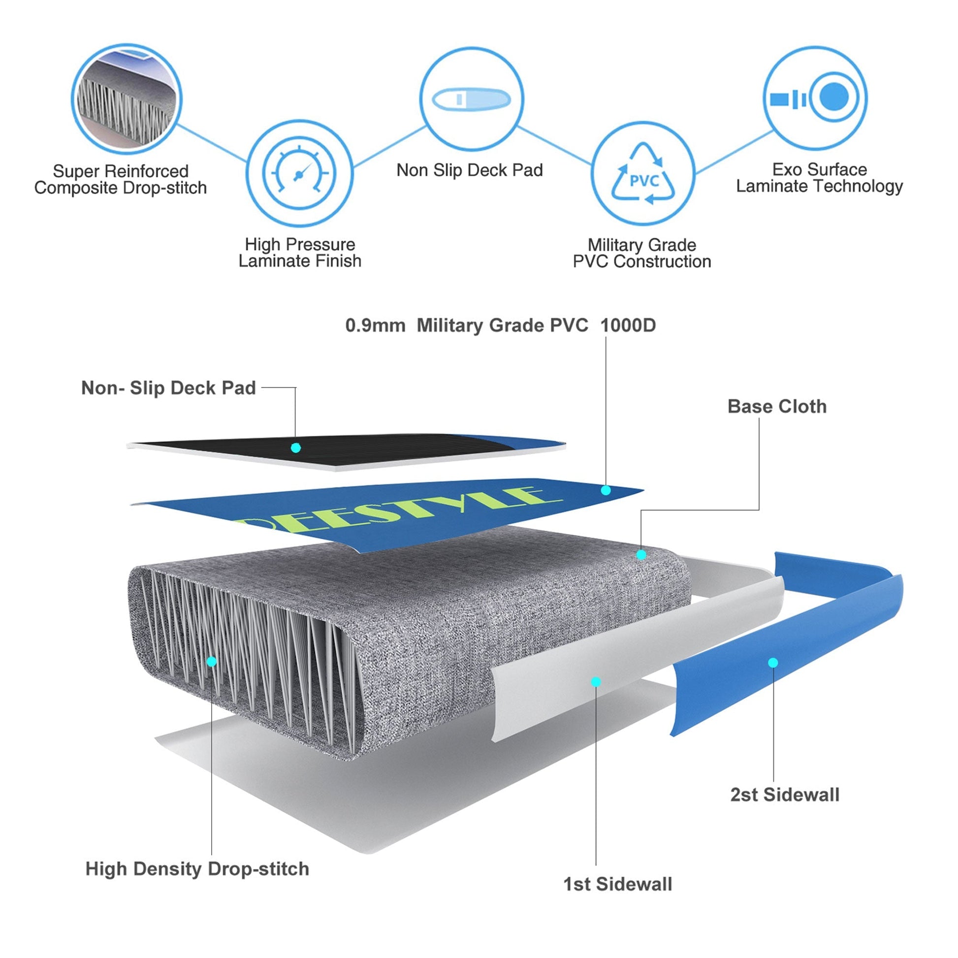 - Durable PVC construction with a drop-stitch inner structure maintains its shape and has a non-slip deck for added safety