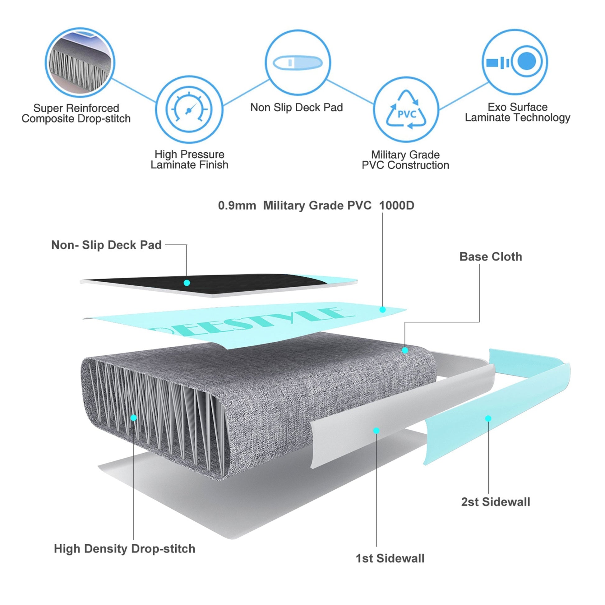 Ideal for use on rivers, oceans, and lakes, this paddleboard set comes with everything you need to get out on the water. An adjustable SUP paddle, removable center fin, and a coil leash keep you safe while you fish, paddle around, or do yoga. The board is crafted with a durable PVC coating to withstand bumps and dings that may happen. The non-slip grip deck keeps you in place while you paddle through canals or around the lake. This portable board features an easy-to-use valve that can be inflated in less than 5 minutes and deflated in 3 minutes so you can spend more time out on the water. This paddle board comes with a SUP paddle, coiled ankle cuff, manual double action pump, removable center fin, carry bag, and a repair kit to quickly fix any holes or scratches that may happen.
