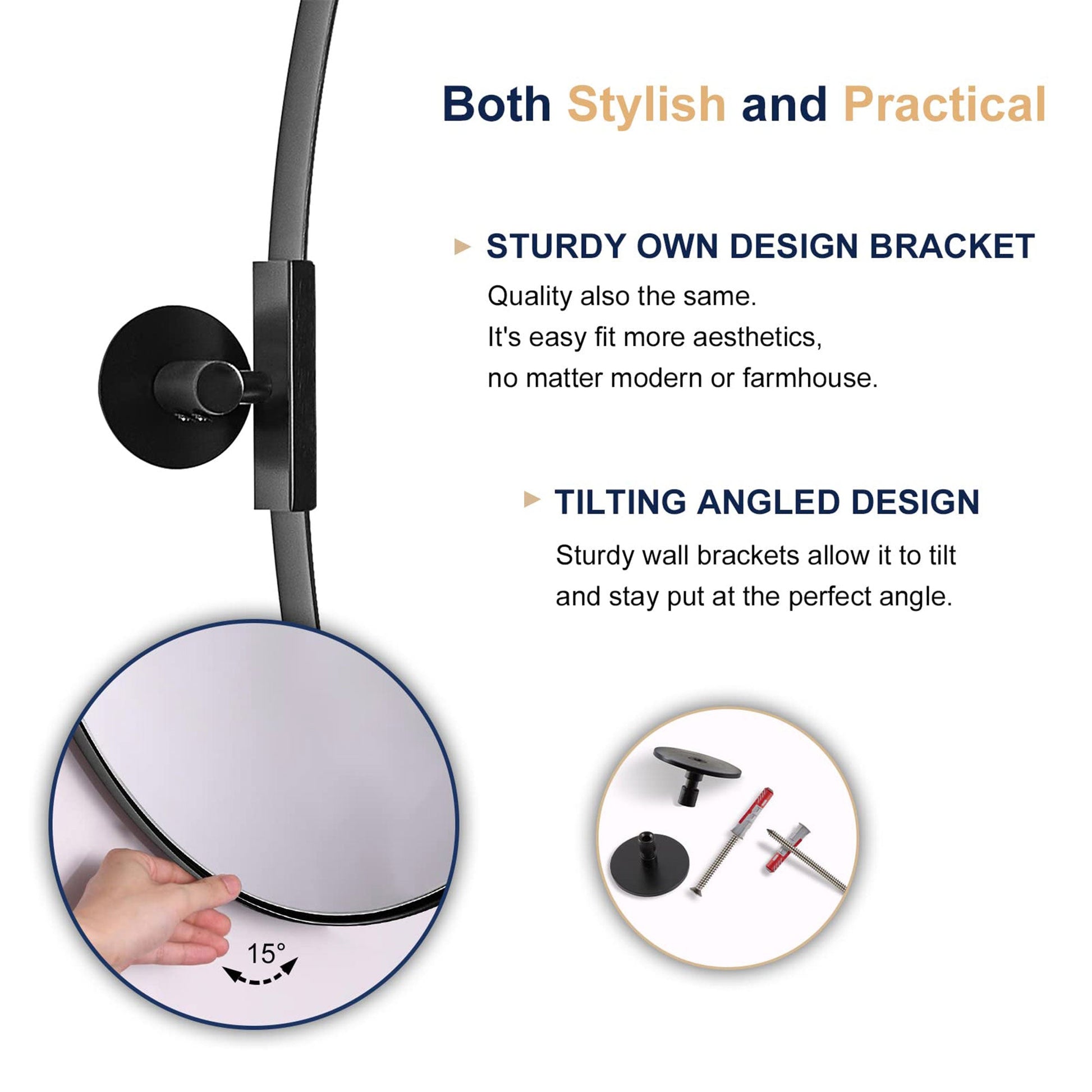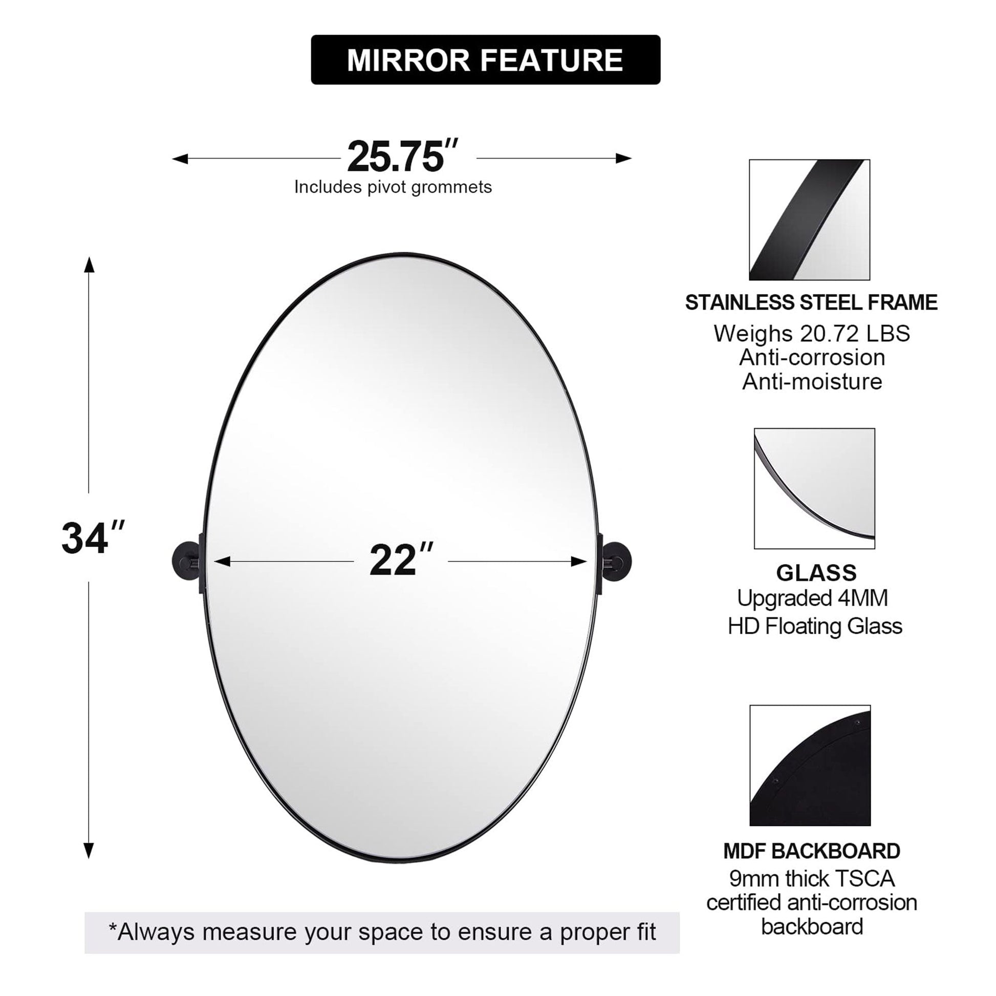 This large, oval wall-mounting bathroom vanity mirror features an adjustable pivoting frame that allows you to tilt the mirror to a customized angle for the perfect personalized setup. Constructed of premium materials including high-quality stainless steel, no-distortion 4MM HD floating glass, 9mm MDF backboard, and sturdy wall brackets, you'll love the way form meets function with this mirror. The durable frame accented by a sleek matte black finish elevates any space, regardless of the existing style or decor, making this mirror a versatile and timeless addition to your home.