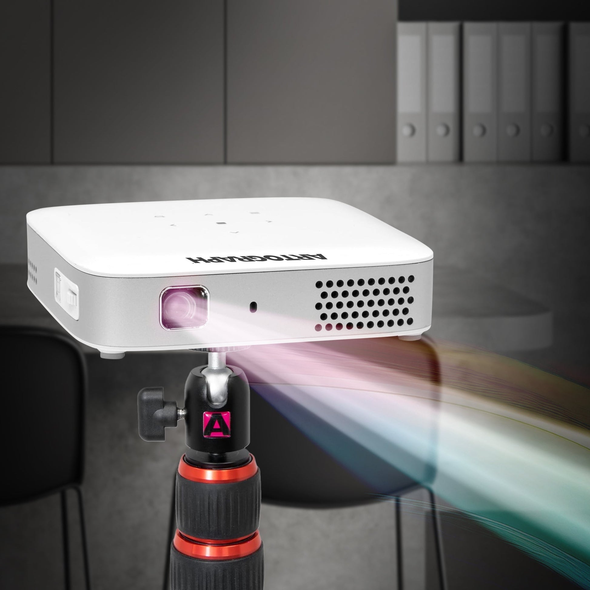 - 360-degree swivel ball head with 90-degree tilt lets you project on walls or work surfaces at any angle for maximum flexibility