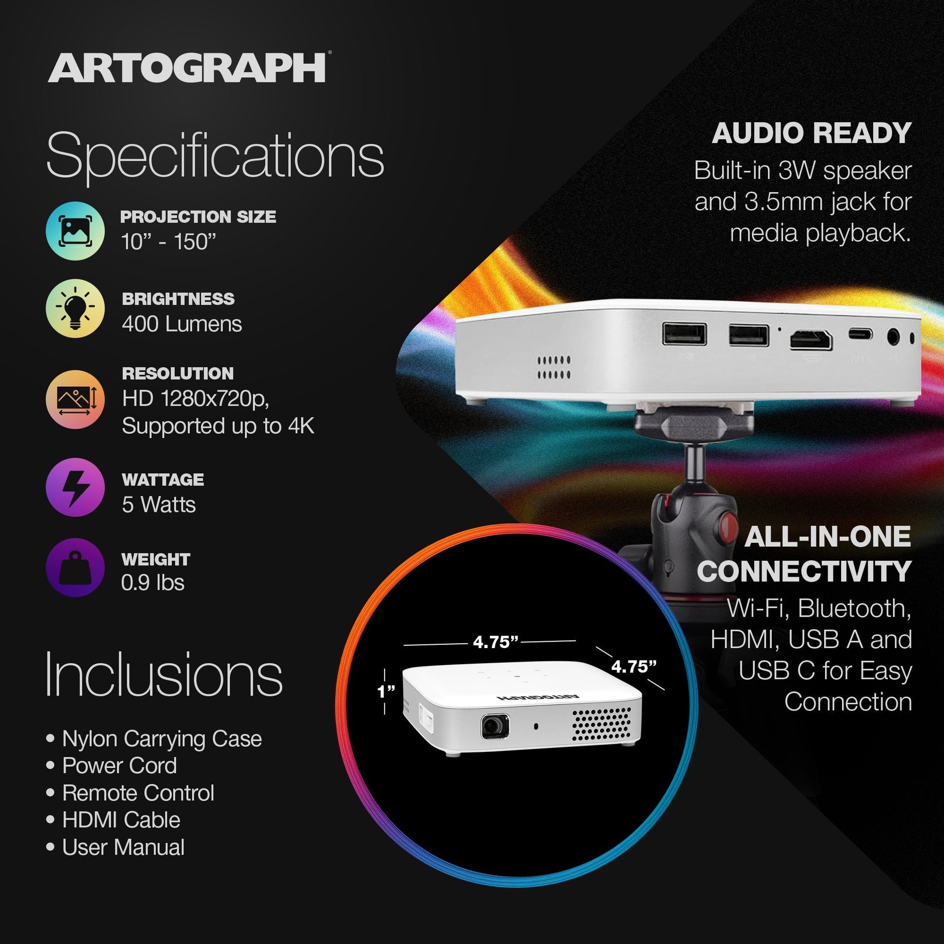 Despite its slim 4.75" x 4.75" x 1" frame and sub-1 lb weight, it boasts powerful features like a 400-lumen LED (30,000-hour lifespan), built-in battery, wireless connectivity, audio output, Bluetooth, and USB/HDMI ports. It’s ready for studio or on-the-go use and comes with a nylon carrying case.