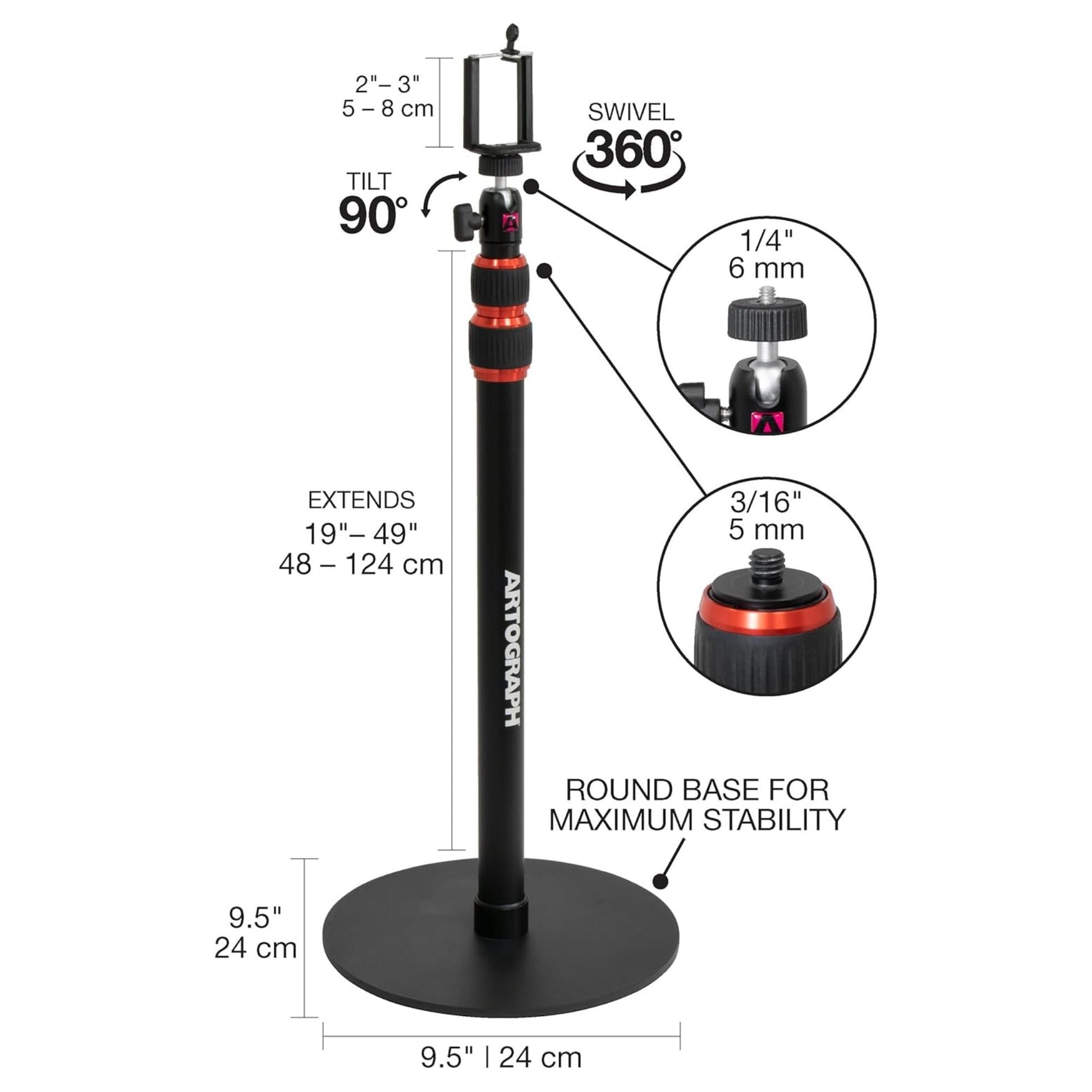 A versatile, height-adjustable stand (19"–49") designed for projectors, cameras, phones, and lights. It features both 3/16" and 1/4" bolts, a 360° swivel ball adapter, and a phone holder (expands 2"–3"). Tilt and rotate with ease for optimal angles in any creative setup.