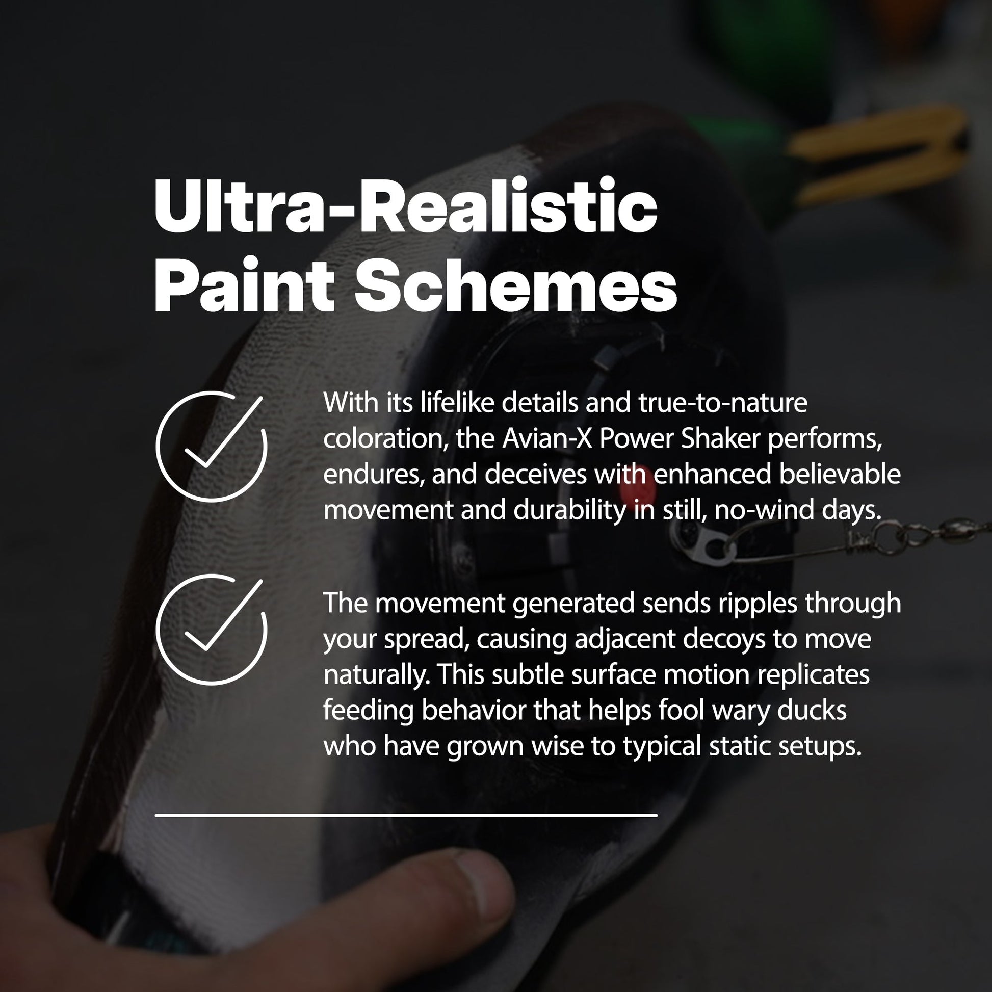 Powered by 4 AA batteries (not included), the internal shaker module delivers up to 10 hours of lifelike water disturbance. The motion generated sends ripples through your spread, causing adjacent decoys to move naturally. This subtle surface movement replicates preening and feeding behavior that helps fool wary ducks who have grown wise to typical static setups.