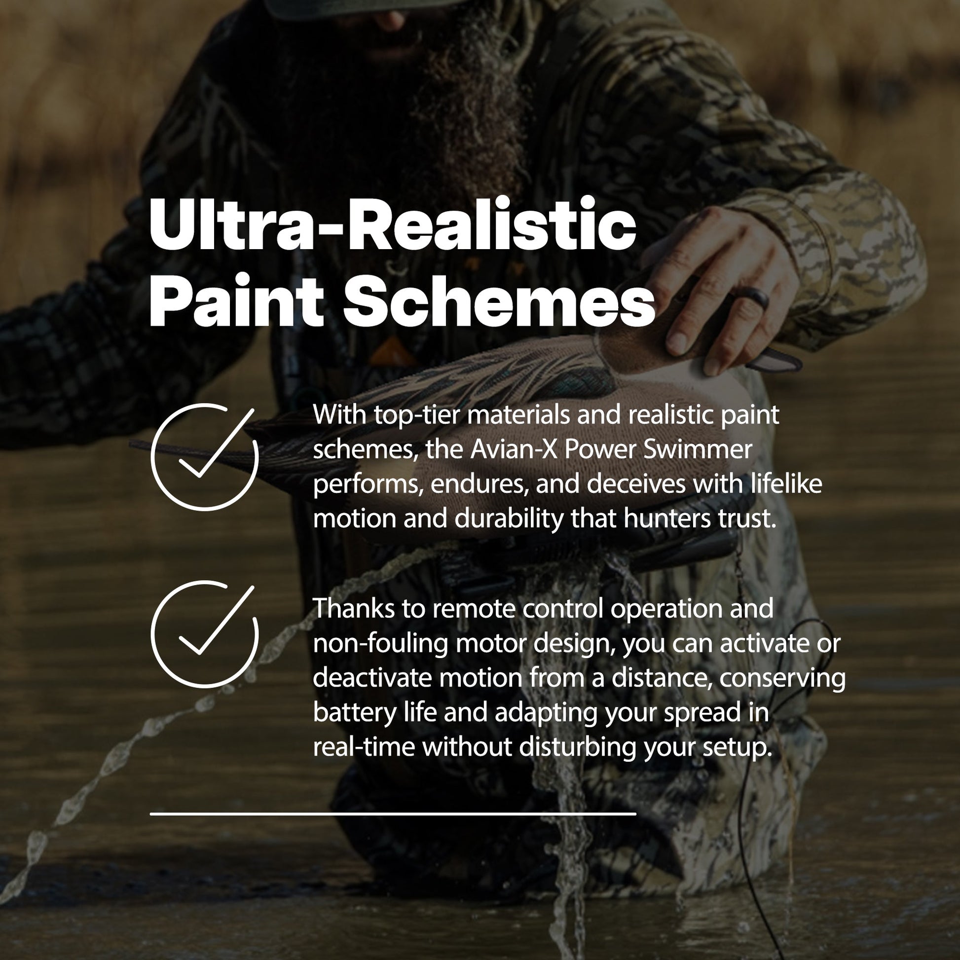 Thanks to remote control operation, you can activate or deactivate motion from a distance, conserving battery life and adapting your spread in real-time without disturbing your setup. With top-tier materials and realistic paint schemes, the Avian-X Power Swimmer doesn’t just float—it performs, endures, and deceives with lifelike motion and durability that hunters trust.