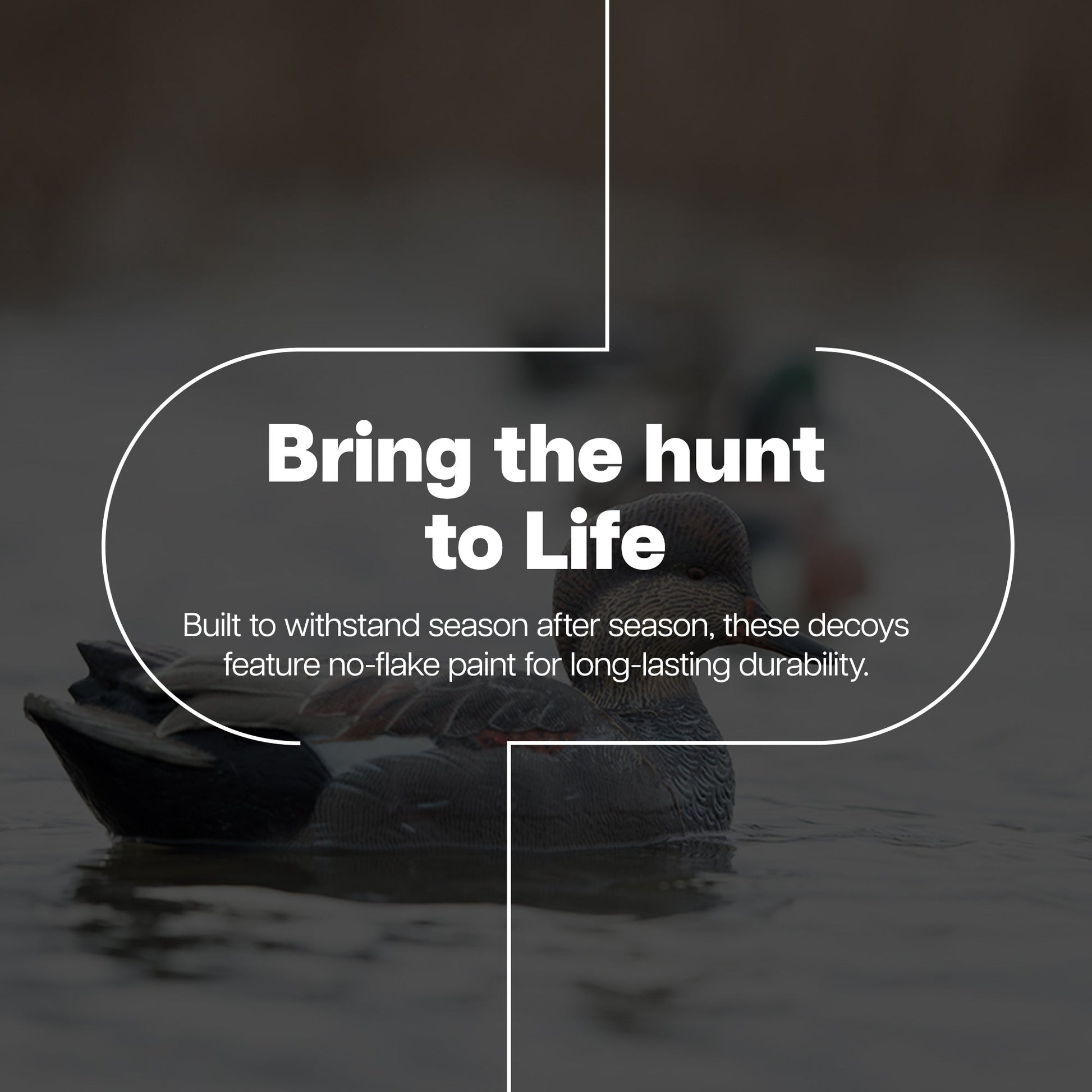 Known for their wariness, these ducks often circle spreads, gaining altitude with each pass. These decoys level the playing field, created with the attitude and appearance of fully plumed, late-season gray ducks. Each hunting decoy perfectly replicates the short, robust body shape and spot-on silver-gray sheen of a mature gadwall, ensuring they fool even the most cautious birds.