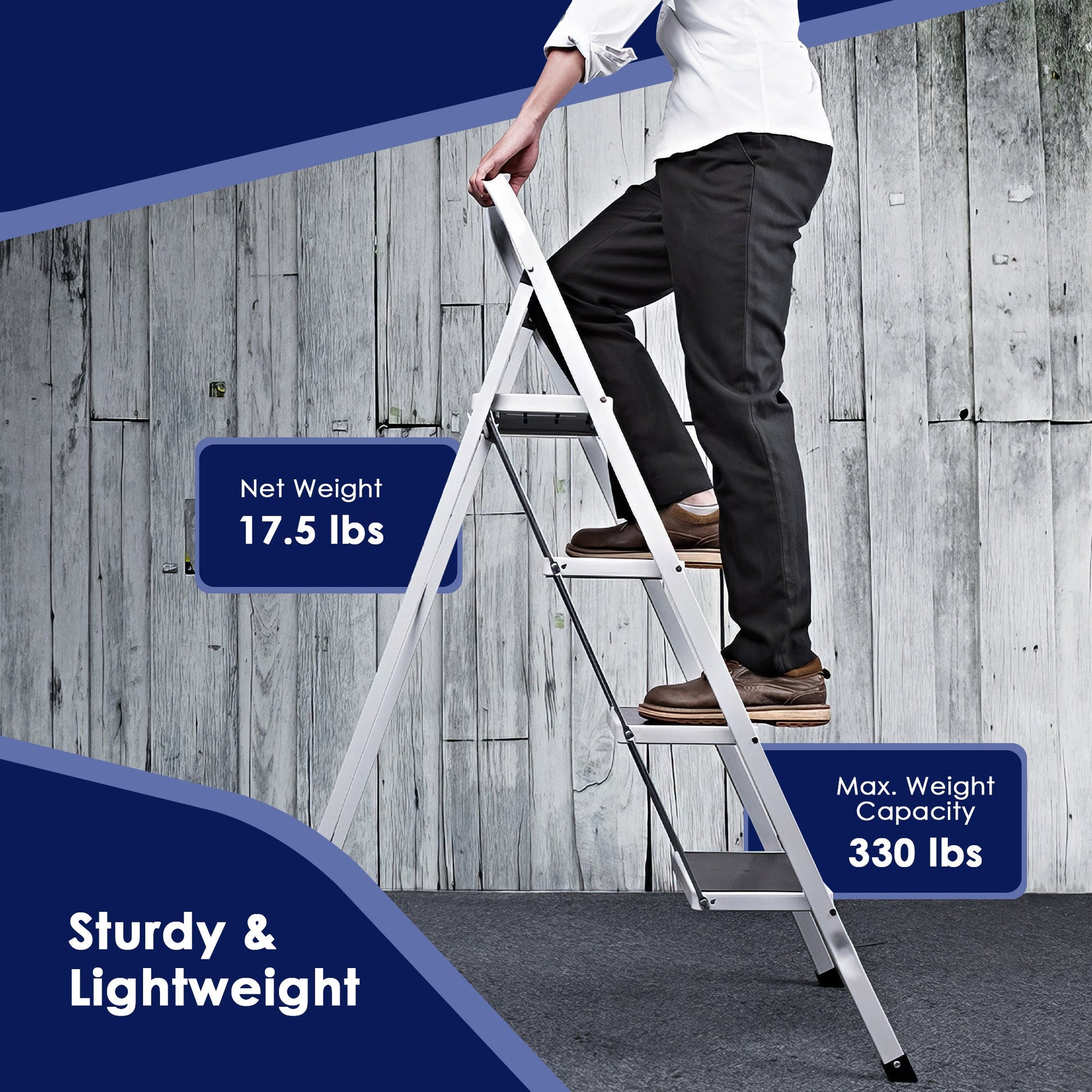 - Versatile task 4-step ladder provides multi-use to reach high-up spaces, ideal for indoor kitchens, bathrooms, offices, or outdoor garages