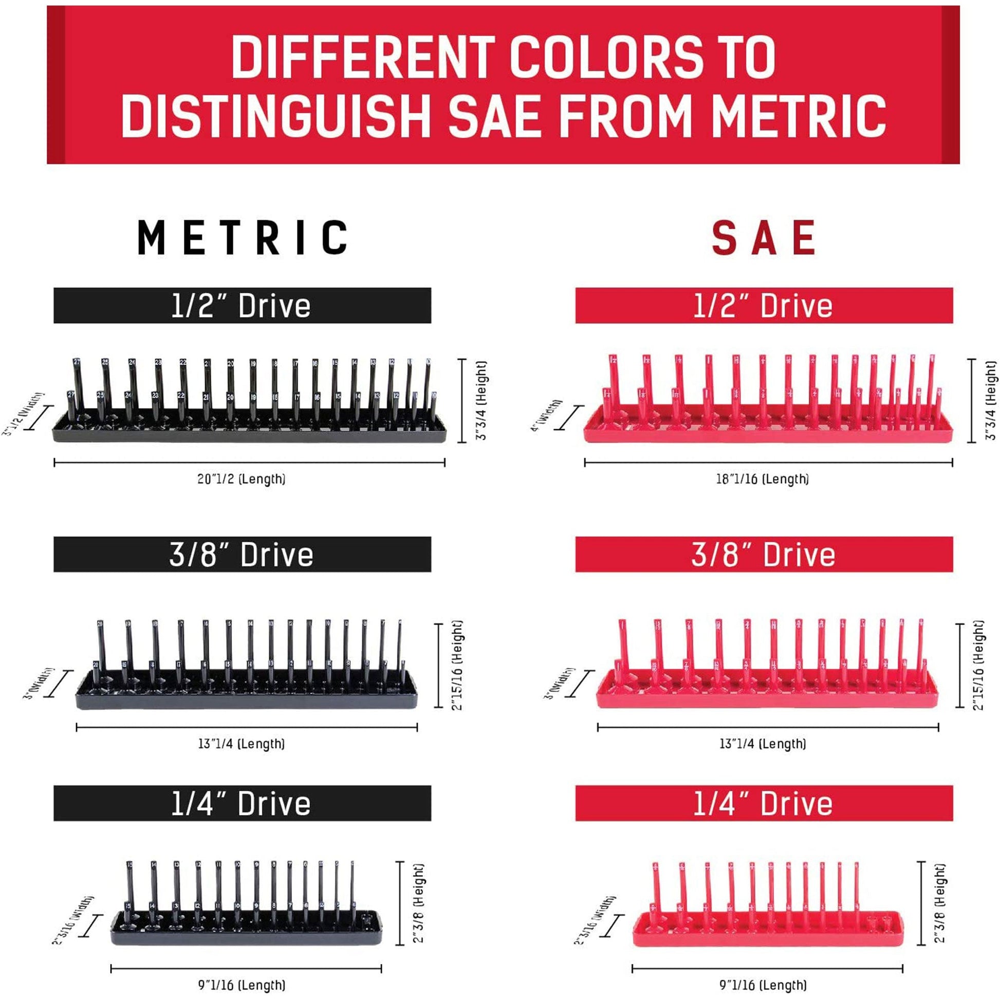 - Each organizer tray includes 3 red SAE trays, 3 black metric trays, and size labeling for easy size recognition