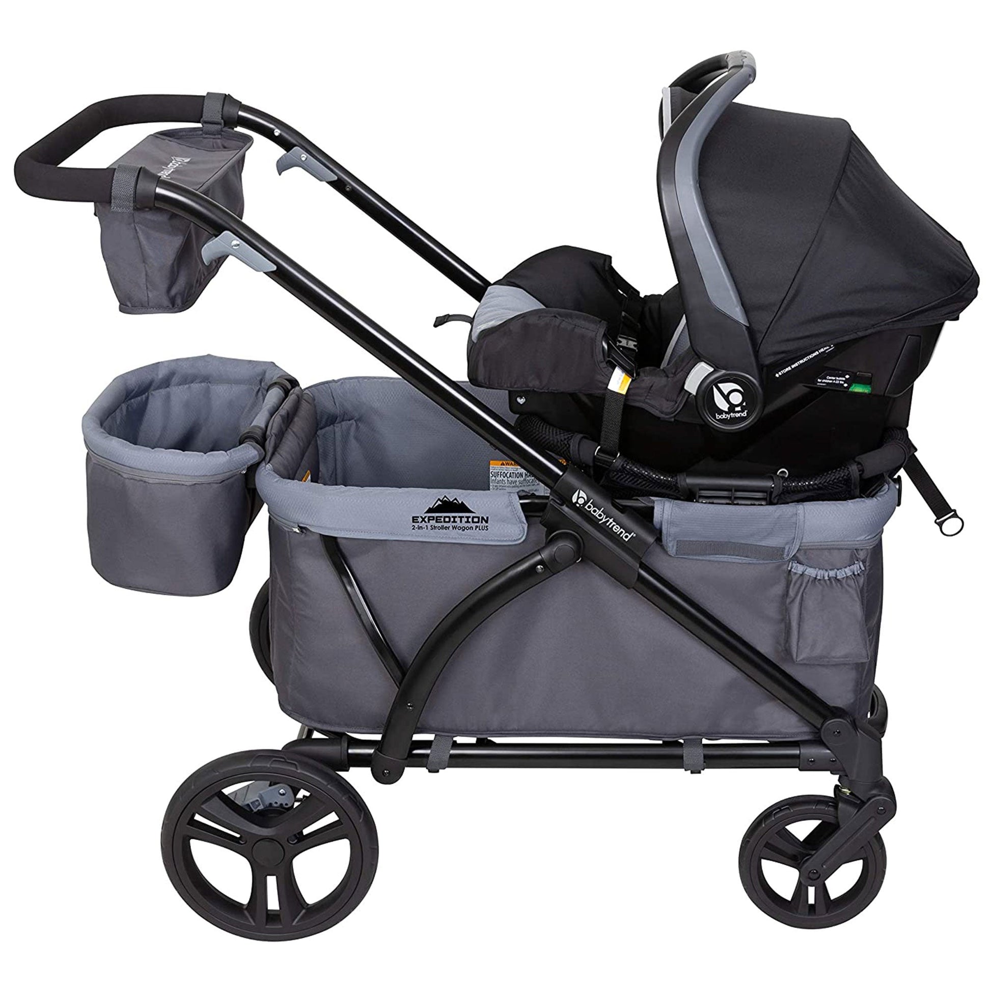 Explore the neighborhood park or the great outdoors knowing your child is safe and secure in the Expedition 2-in-1 Stroller Wagon by Baby Trend. This stroller wagon features a car seat attachment adapter option for infant carrier seats and converts into a 2-seat stroller or wagon as your baby grows.