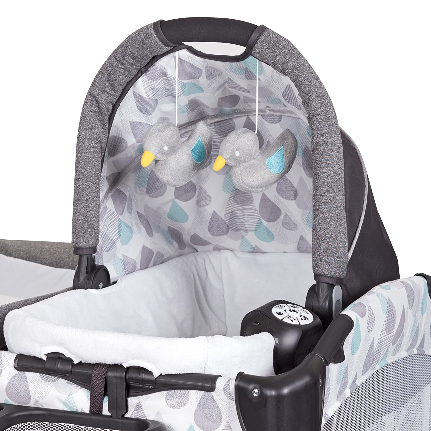- Includes removable full-sized bassinet/rocker, multi-textured mattress pad, diaper changer with parent organizer, spacious play yard, and travel/storage tote bag