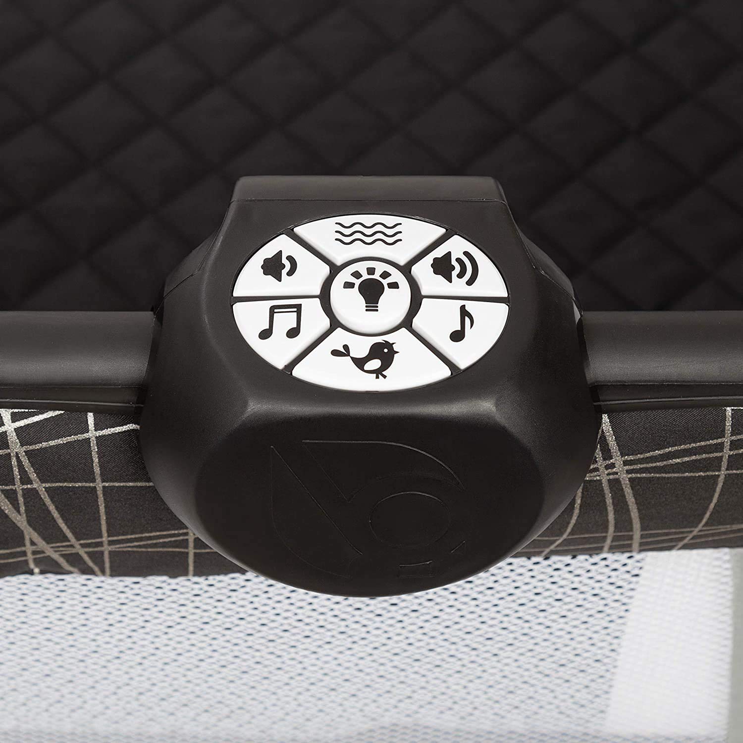 The Rock a Bye bassinet has a deluxe canopy and comes with a pair of plush toys, making sleep time anytime. Pair the bassinet with the electronic music station for an easy lullaby during nap time. Plus, this center is portable courtesy of easy-rolling caster wheels.