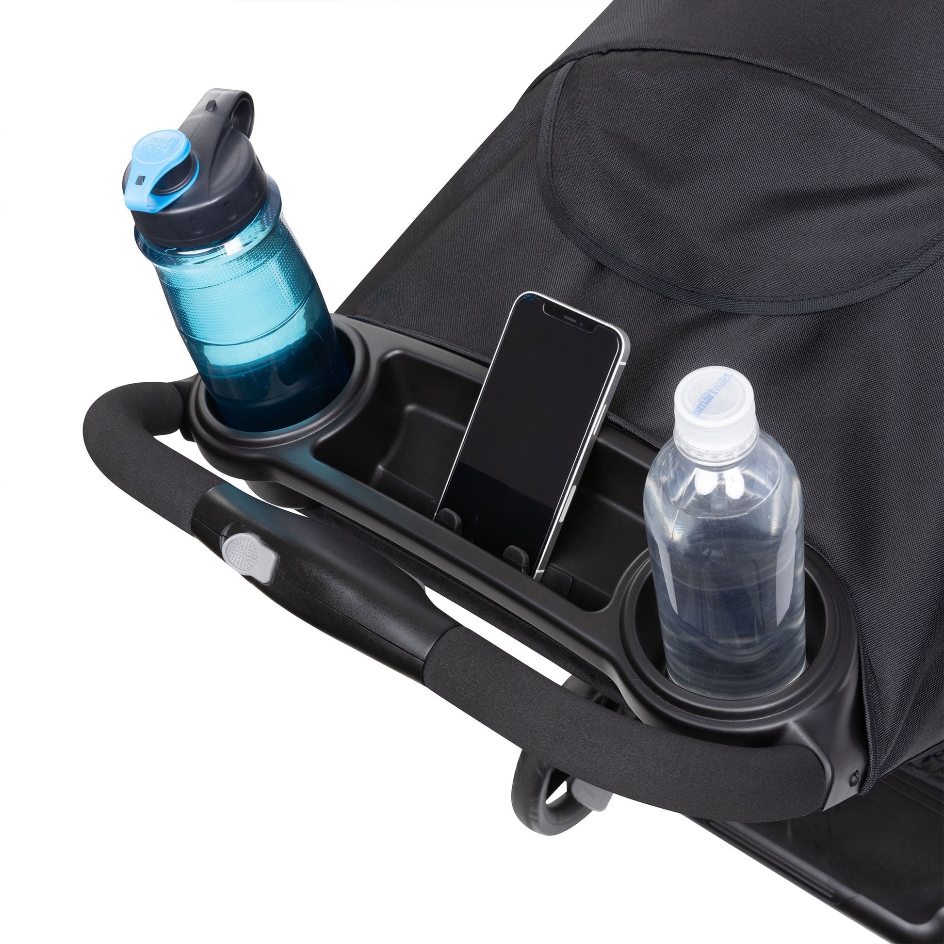 - Covered parent tray with 2-cup holders, covered compartment, and an extra-large basket for extra storage