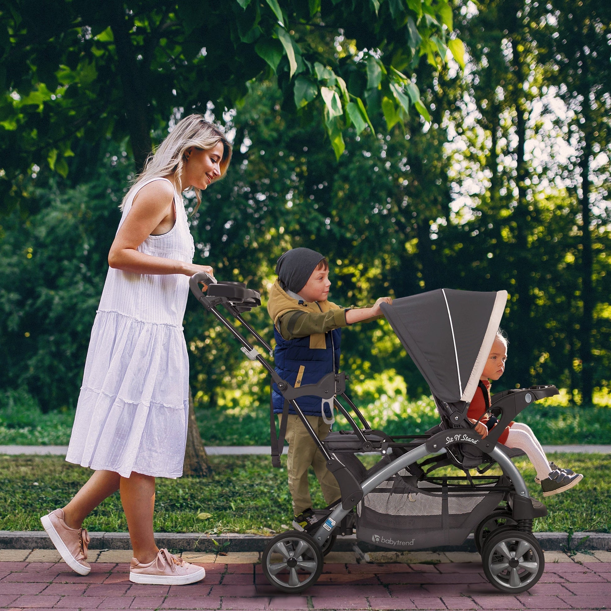 Whether you're leisurely strolling through the sun-dappled park on a tranquil afternoon or embarking on a bustling day filled with a myriad of errands, rest assured that the Baby Trend Sit N' Stand Double Toddler Stroller stands as your unwavering guardian of child safety and comfort. This innovatively designed infant toddler stroller caters to children of all ages, offering a versatile solution that accommodates the dynamic demands of your day. This Baby Trend Stroller stands unwaveringly by you, ensuring that your children remain not only safe and secure but also enveloped in the warmth of your care and love.