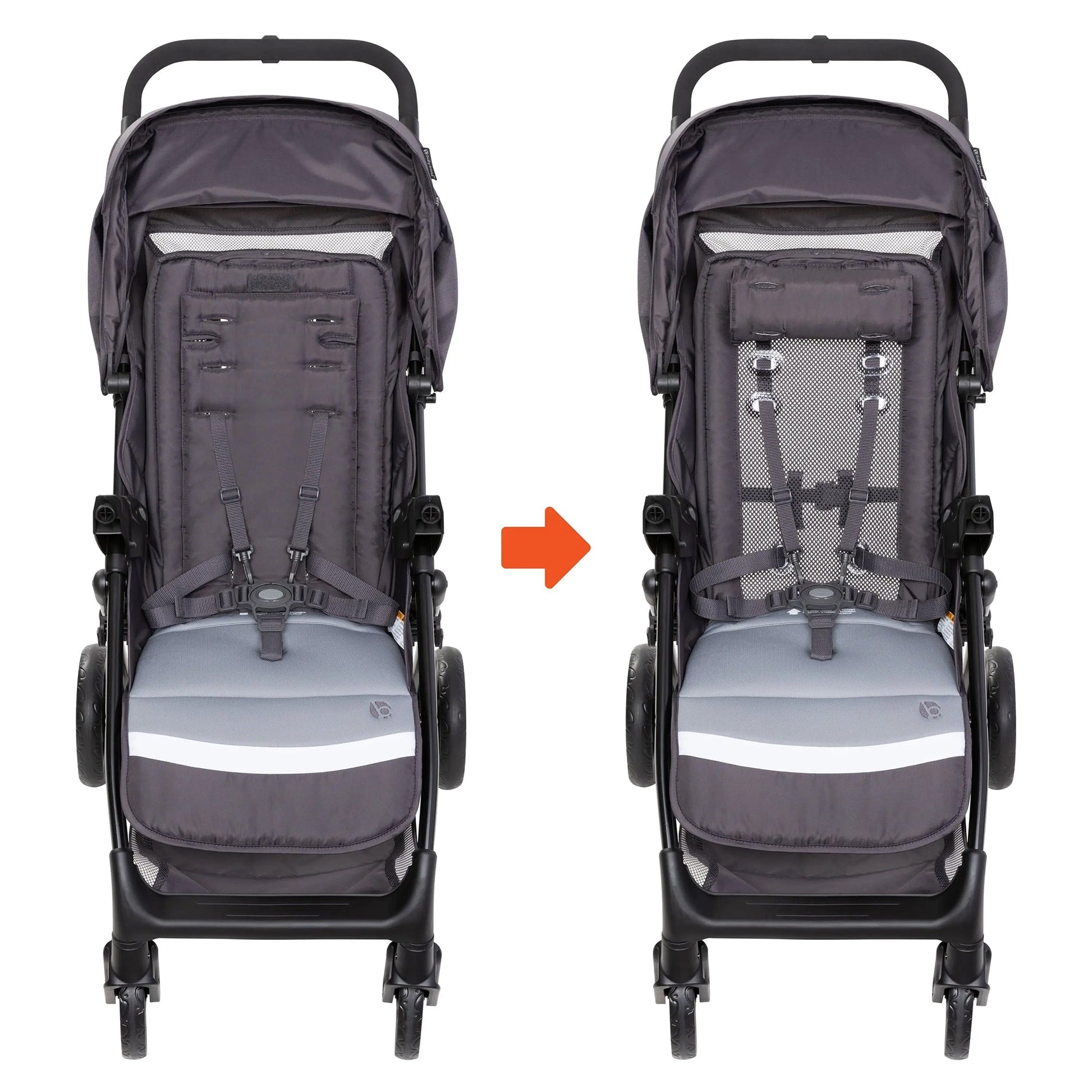 - Versatile stroller seamlessly converts from a traditional backrest to a breathable, mesh backrest by simply rolling up the seat back