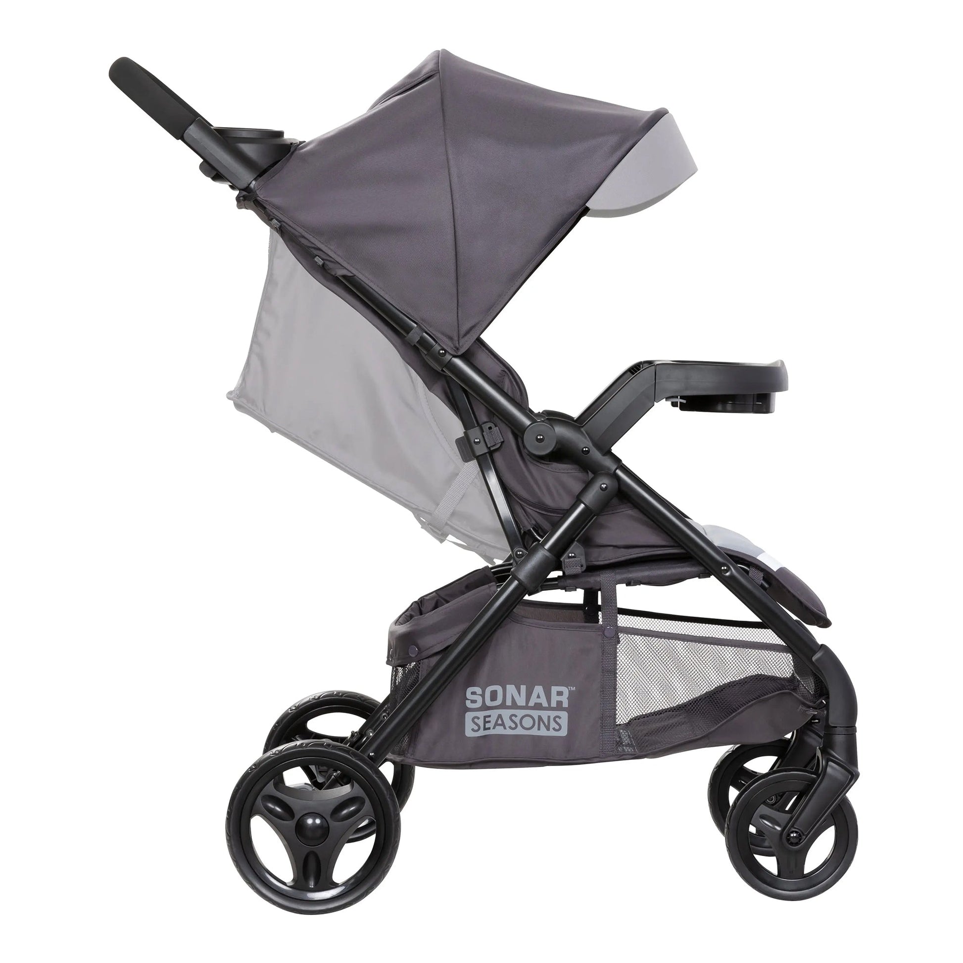 The single stroller features a plush, padded seat and a UPF 50+ canopy, shielding your little one from the sun's harmful rays. The large, easy-access basket provides ample storage space for all your essentials, while the parent and child trays with cup holders keep you hydrated and your hands free. Designed for seamless maneuverability, the Sonar Seasons boasts a one-hand, in-seat center fold, making it a breeze to transport and store. Its durable, lightweight frame and never-flat tires ensure a smooth ride, whether you're navigating city streets or exploring nature's paths.