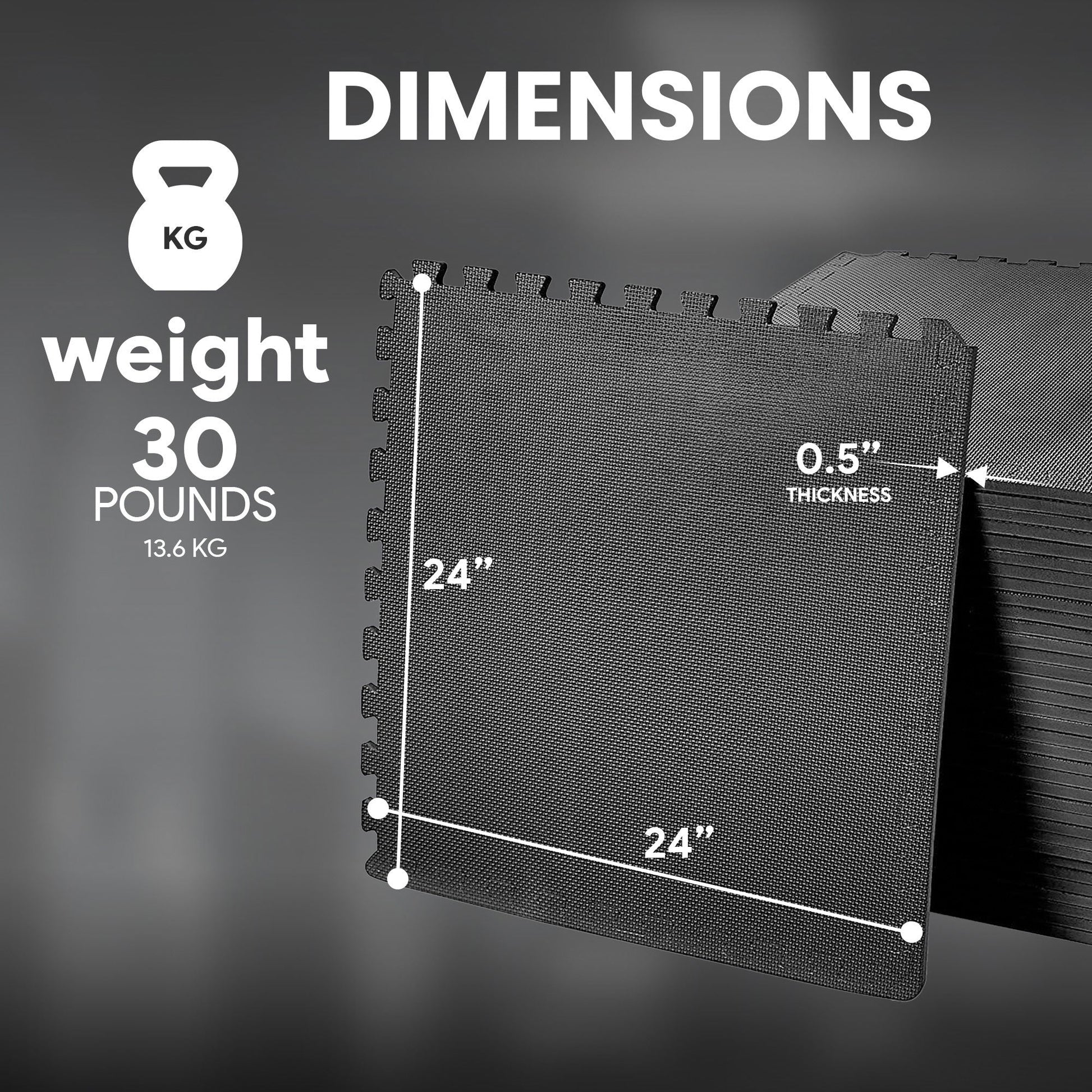 Made from high-density EVA foam, these 0.5-inch thick floor mats comfortably cushions your spine, hips, knees, and elbows on hard floors. The double-sided non-stick surfaces have excellent slip resistance to prevent injury and hold the mat in place. The moisture-wicking technology repels any sweat or spilled liquids that could cause a smelly or stained mat. When the times come for a cleaning, rub-down the mat with warm water and soap. The lightweight design makes setting up in your home, gym, or daycare a breeze. With 36 24 by 24-inch exercise tiles with interlocking edges and 72 end borders, you get 144 square feet of durable support. Whether you're creating a dedicated exercise area at home, outfitting a professional gym, or ensuring a safe play area in a daycare, these mats offer versatile and reliable support. Their portability means you can change your setup as needed, providing convenience without compromising on quality