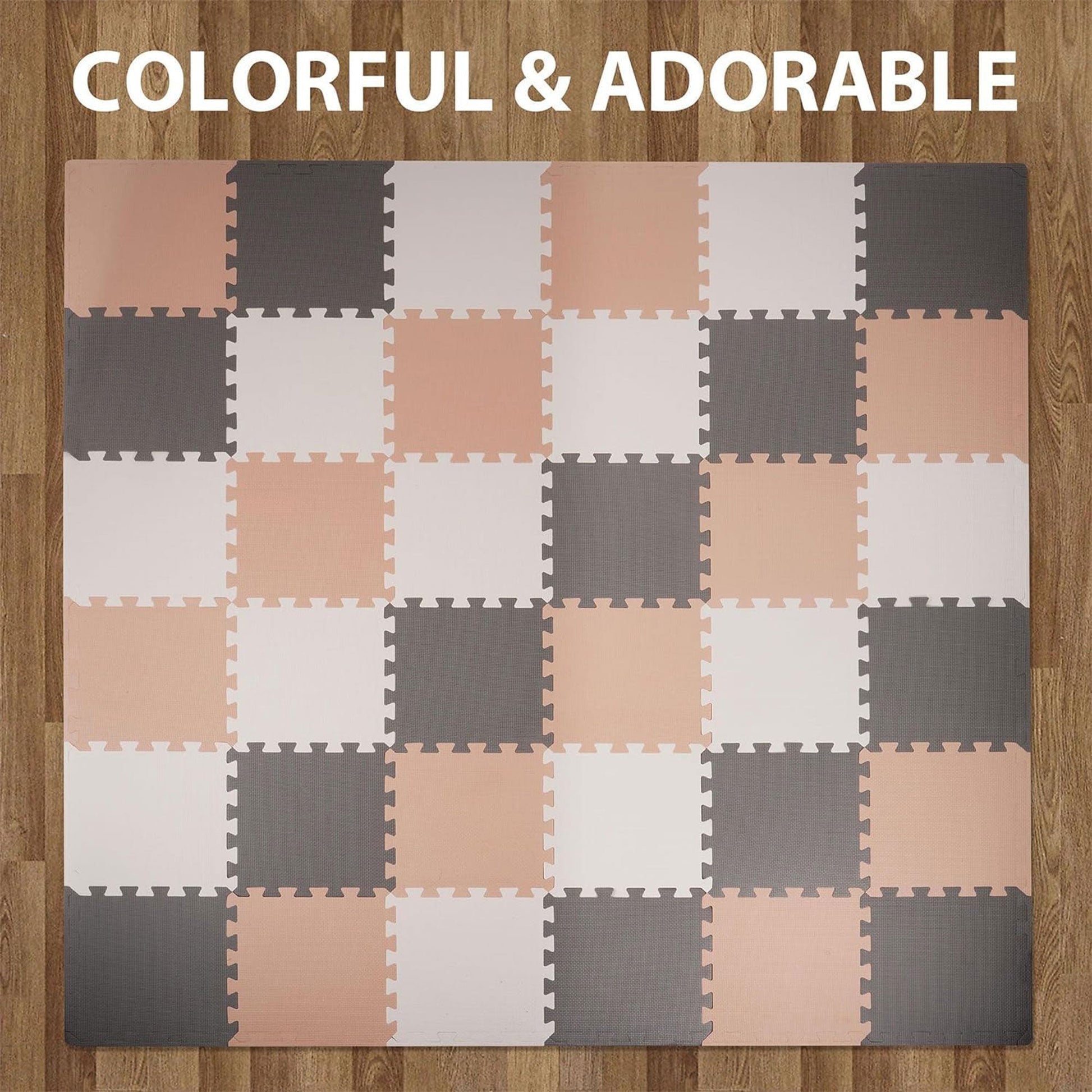 - Featured color scheme of cream, gray, and beige, this interlocking mat pack covers up to 16 square feet of play space, with each tile measuring 1 square foot