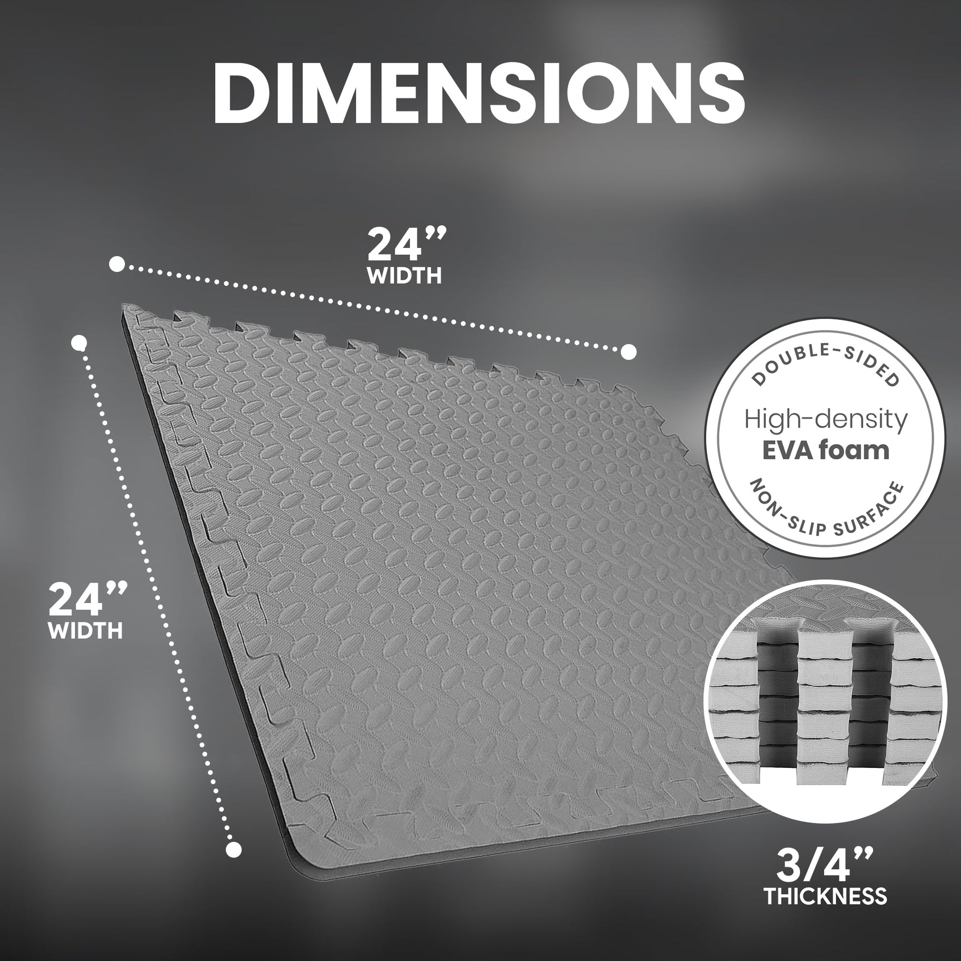 - Tile measurement (L x W x H): 24 x 24 x 0.75 inches per tile