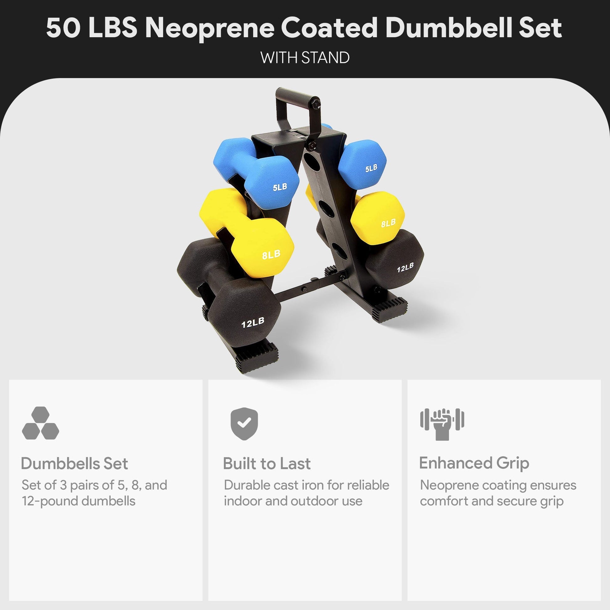 - Equipment includes (2) 5-pound, (2) 8-pound, and (2) 12-pound dumbbell weights for fitness enthusiasts of all levels