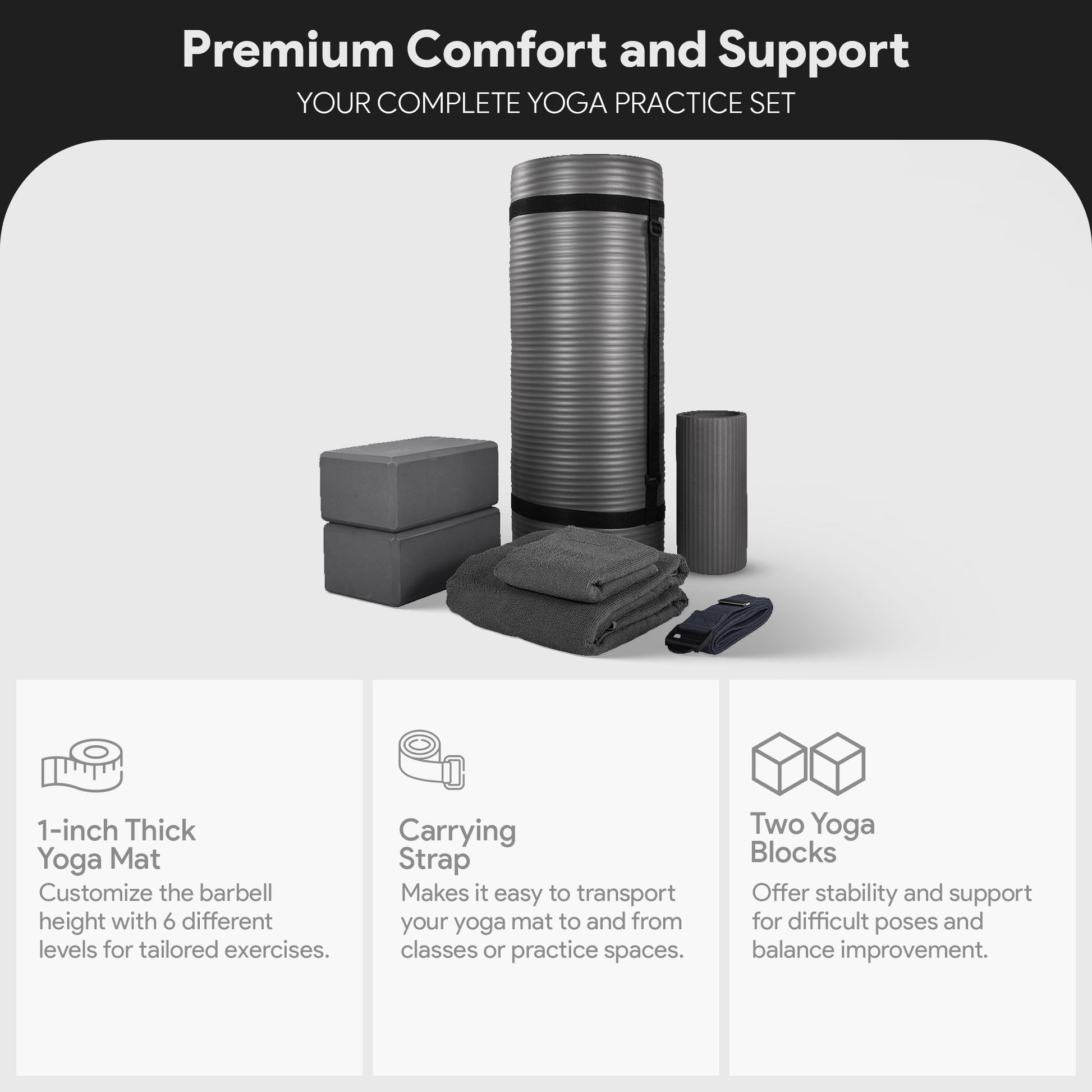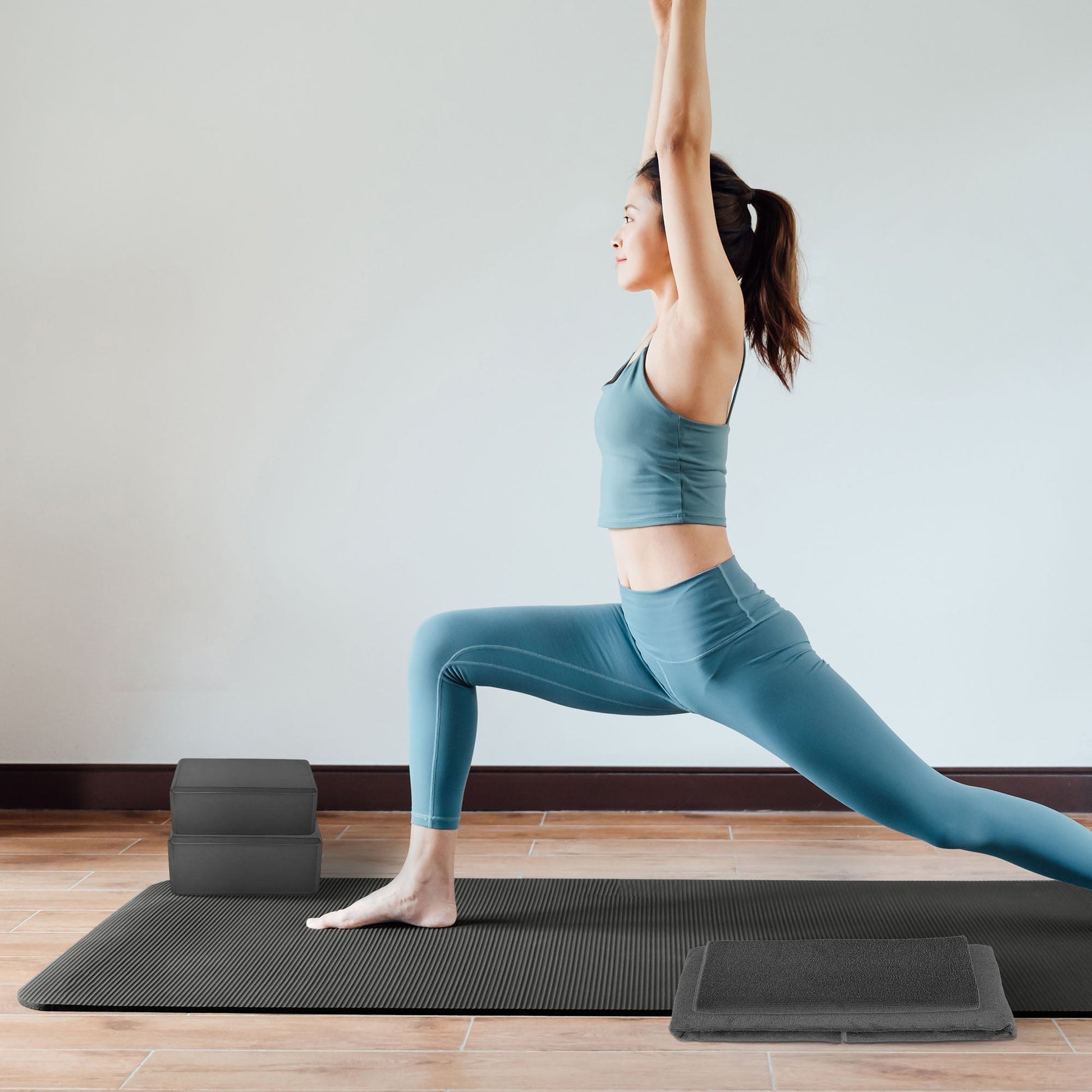 - Set includes 1 mat with carrying strap, 2 blocks, 1 stretch strap, 1 mat towel, 1 hand towel, and 1 knee pad