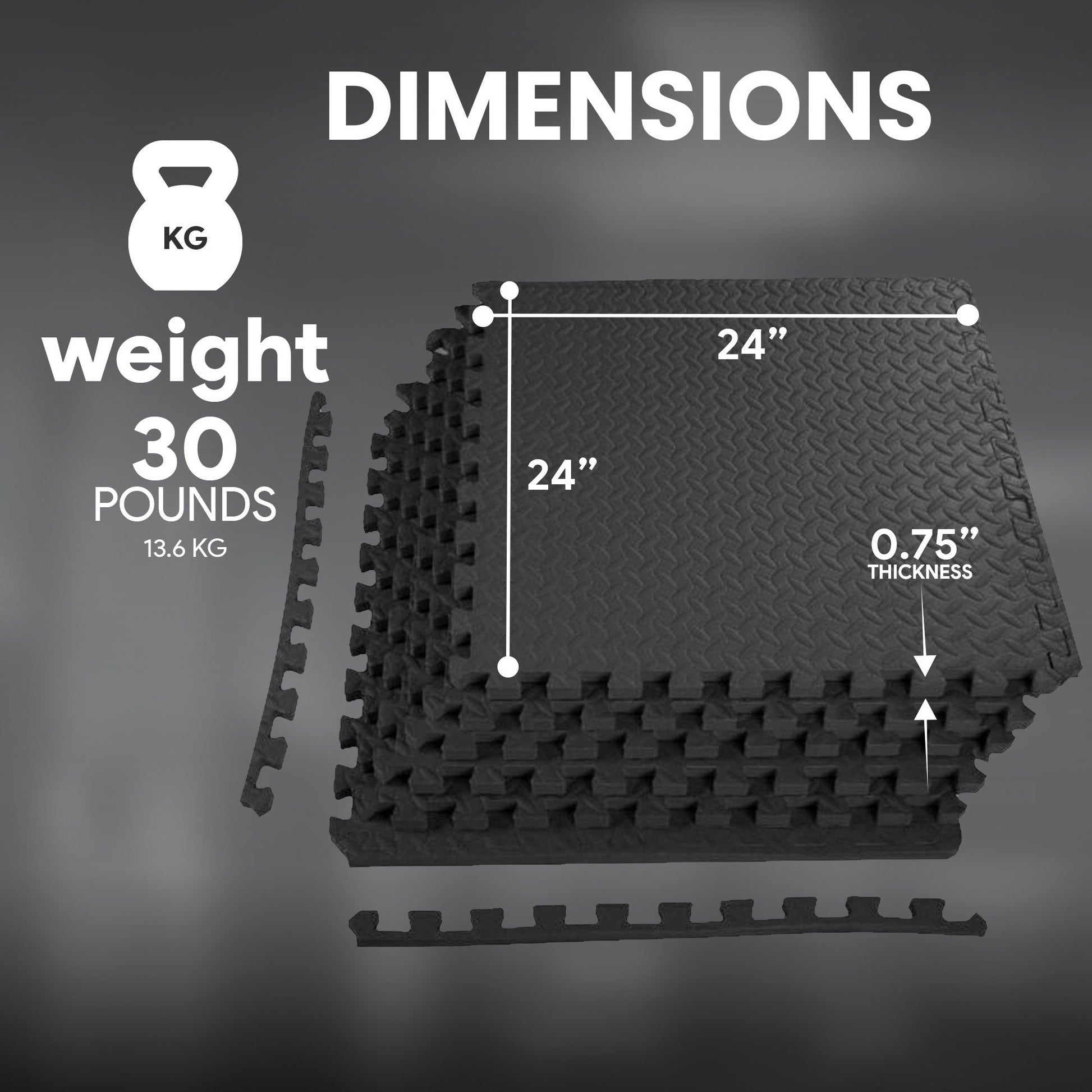 - Set of (2) 24 pieces of 24 by 24-inch foam exercise tiles with interlocking edges and 48 end borders for 96 square feet of durable support in your home, gym, or daycare