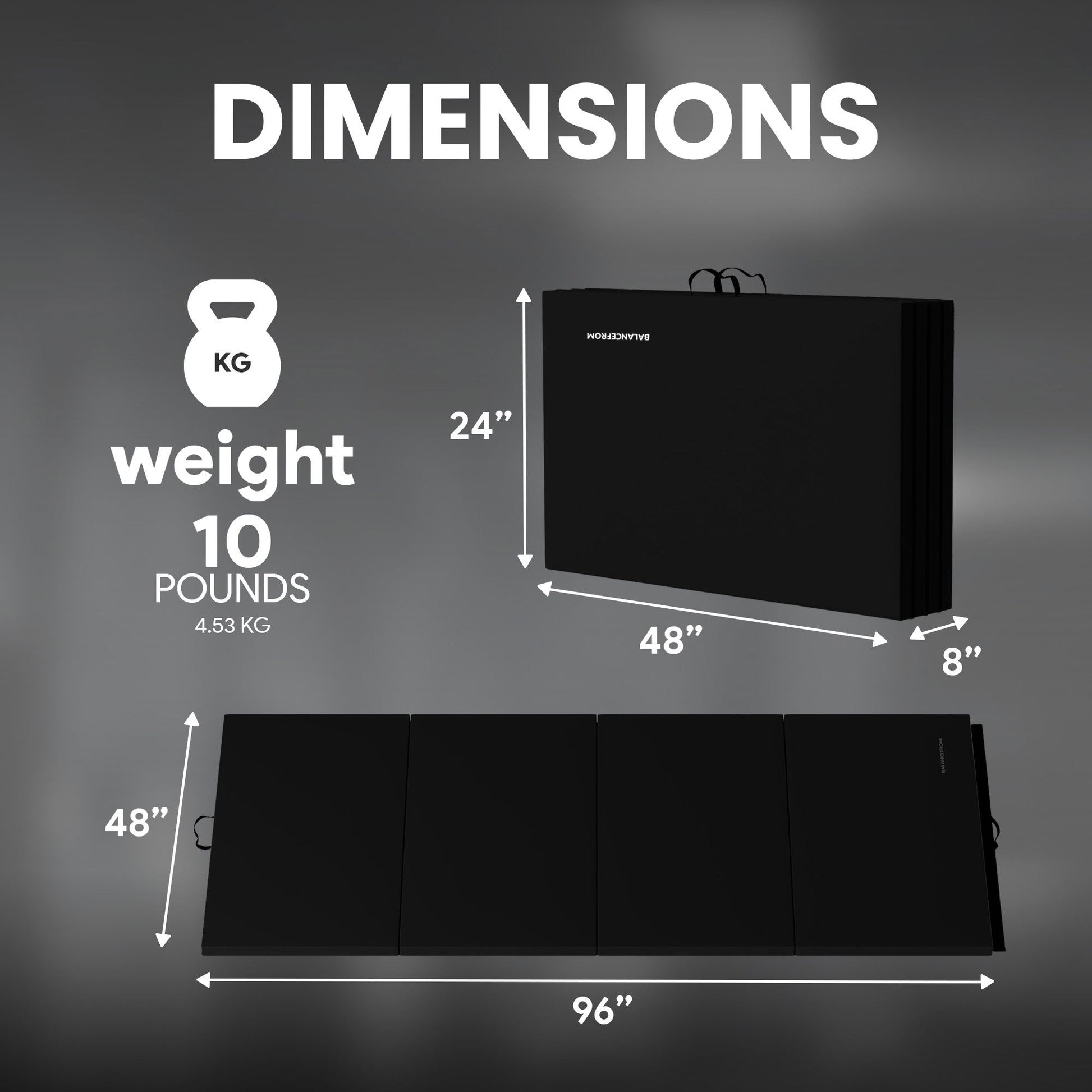 Thanks to the fasteners on all sides, multiple mats can be easily connected to create a larger workout space. The foldable 4-panel design and built-in handles provide simple storage and easy portability, perfect for those on the go. Measuring 96 inches long and 48 inches wide, the exercise mat can be used to perform various full-body strength or cardio workout routines.