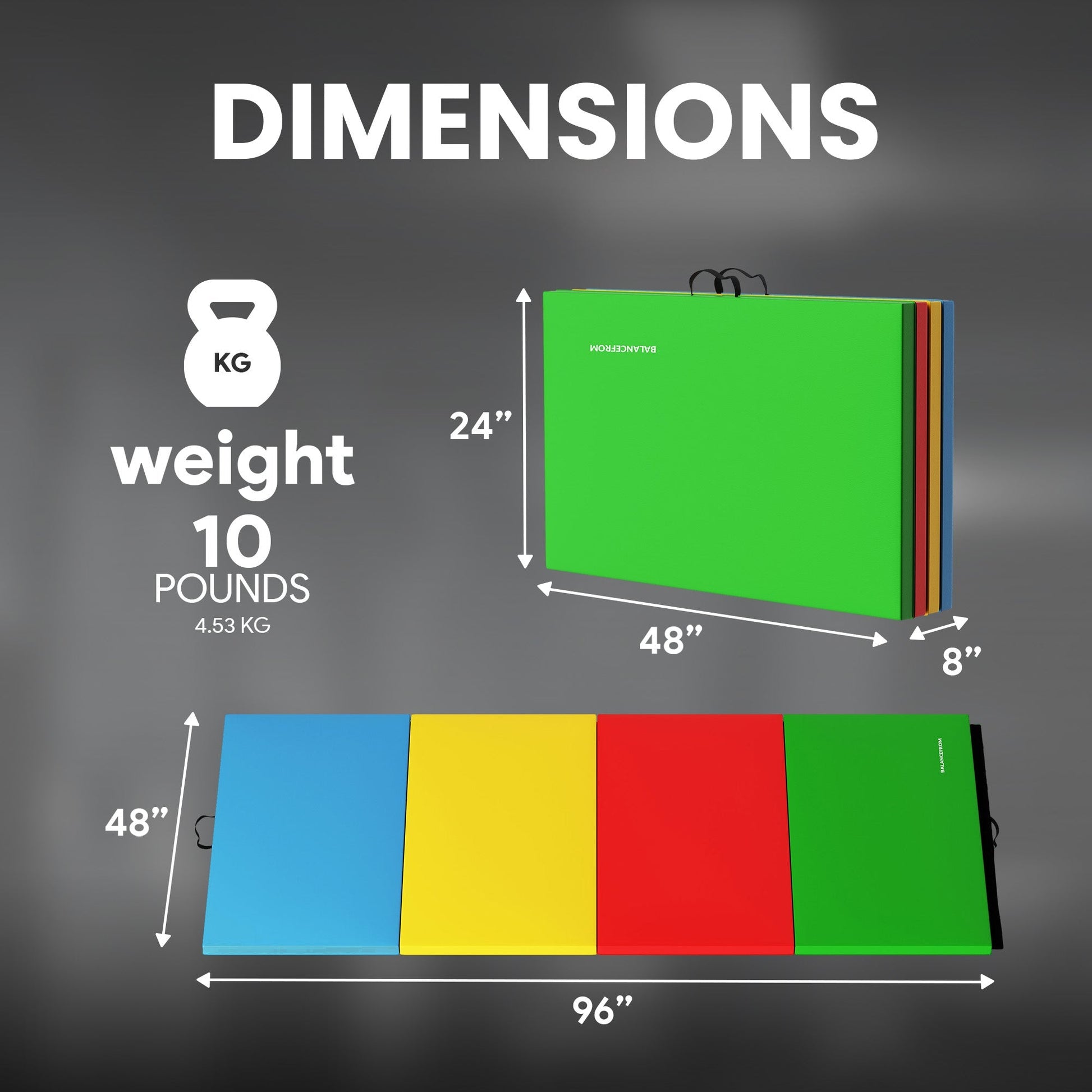 Thanks to the fasteners on all sides, multiple mats can be easily connected to create a larger workout space. The foldable 4-panel design and built-in handles provide simple storage and easy portability, perfect for those on the go. Measuring 96 inches long and 48 inches wide, the exercise mat can be used to perform various full-body strength or cardio workout routines.