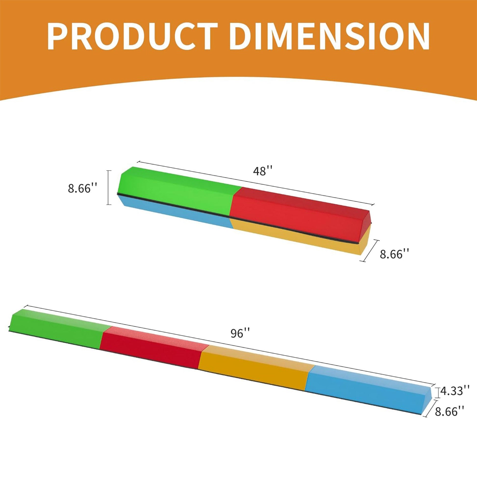 - Gymnastic equipment set includes a 96-inch long by 48-inch wide exercise mat and an 8-inch long balance beam