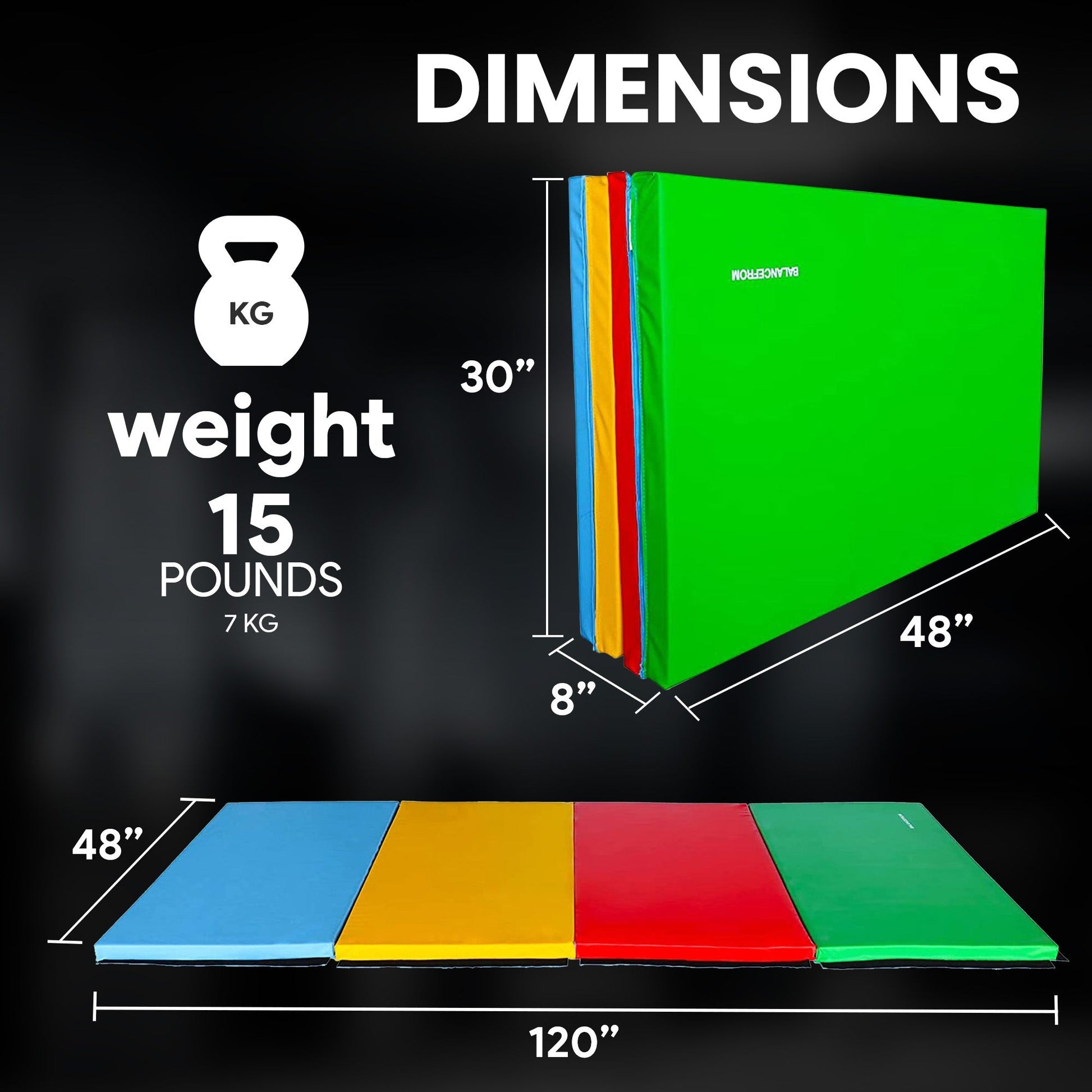 - Gymnastic equipment set includes a 120-inch long by 48-inch wide exercise mat and an 8-inch long balance beam