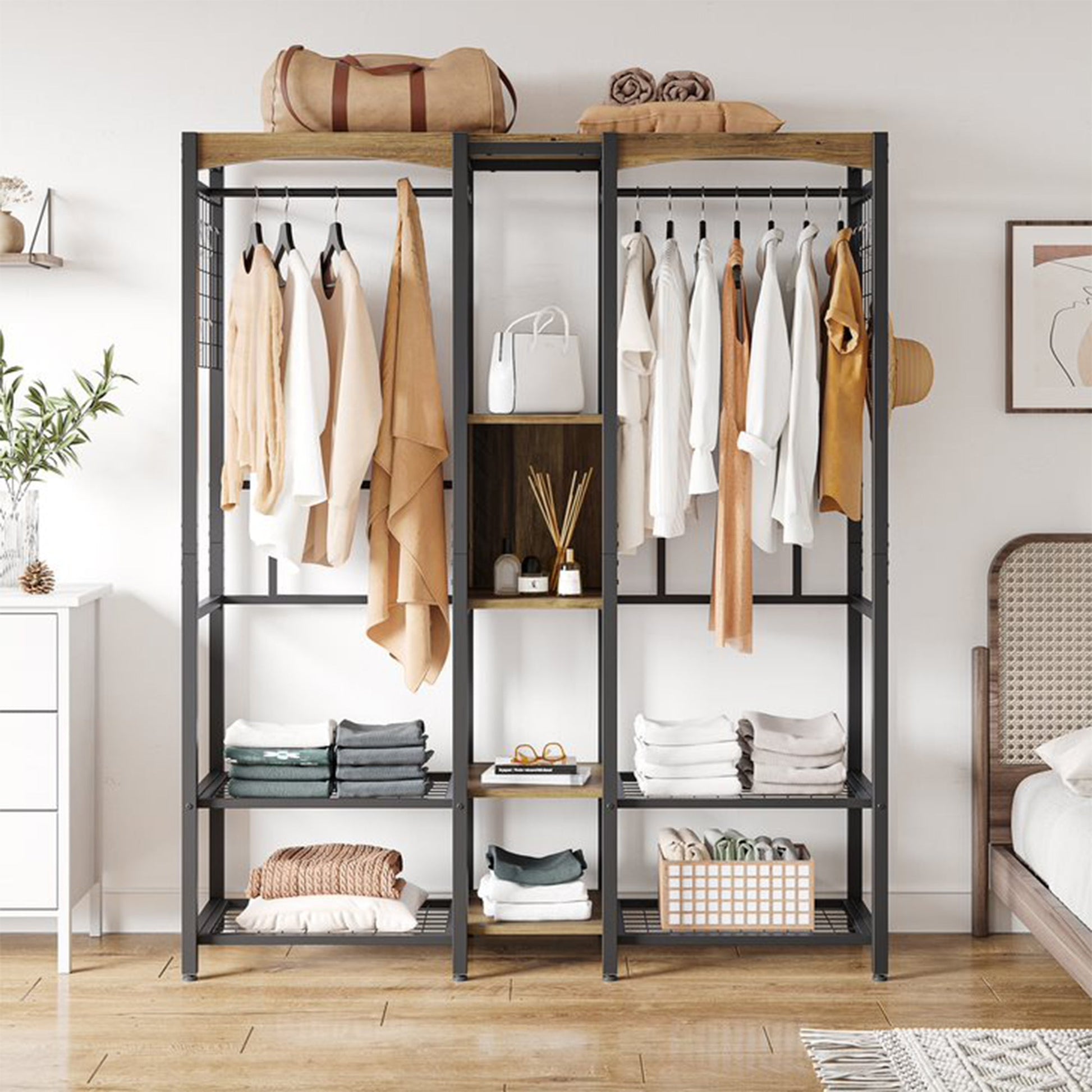 This open-space-designed freestanding wardrobe is the perfect solution for clothing storage in studio apartments, shared spaces, or rooms lacking built-in storage. The 2 hanger rods are perfect for storing dresses, dress shirts, blouses, slacks, jackets, and coats, while the side grids with adjustable hooks can hold your hats, bags, scarves, and accessories. Featured nested in the metal of the double racks are 3 smaller wooden shelves perfect for smaller-sized items.