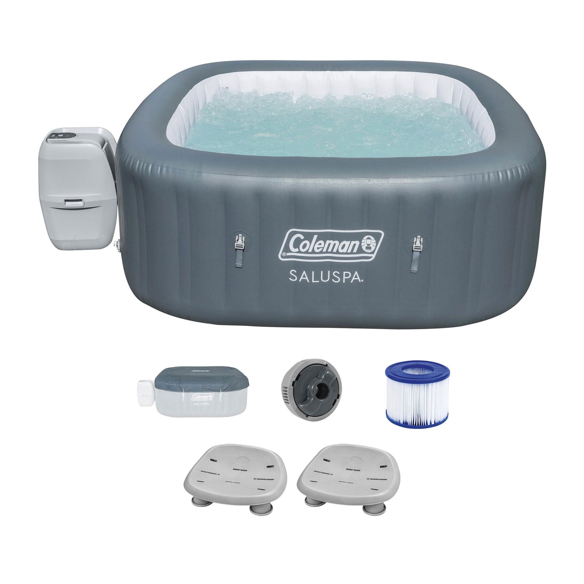 - Equipped with a pump that quickly inflates the spa, heats it up, runs filtration, and controls the massage system