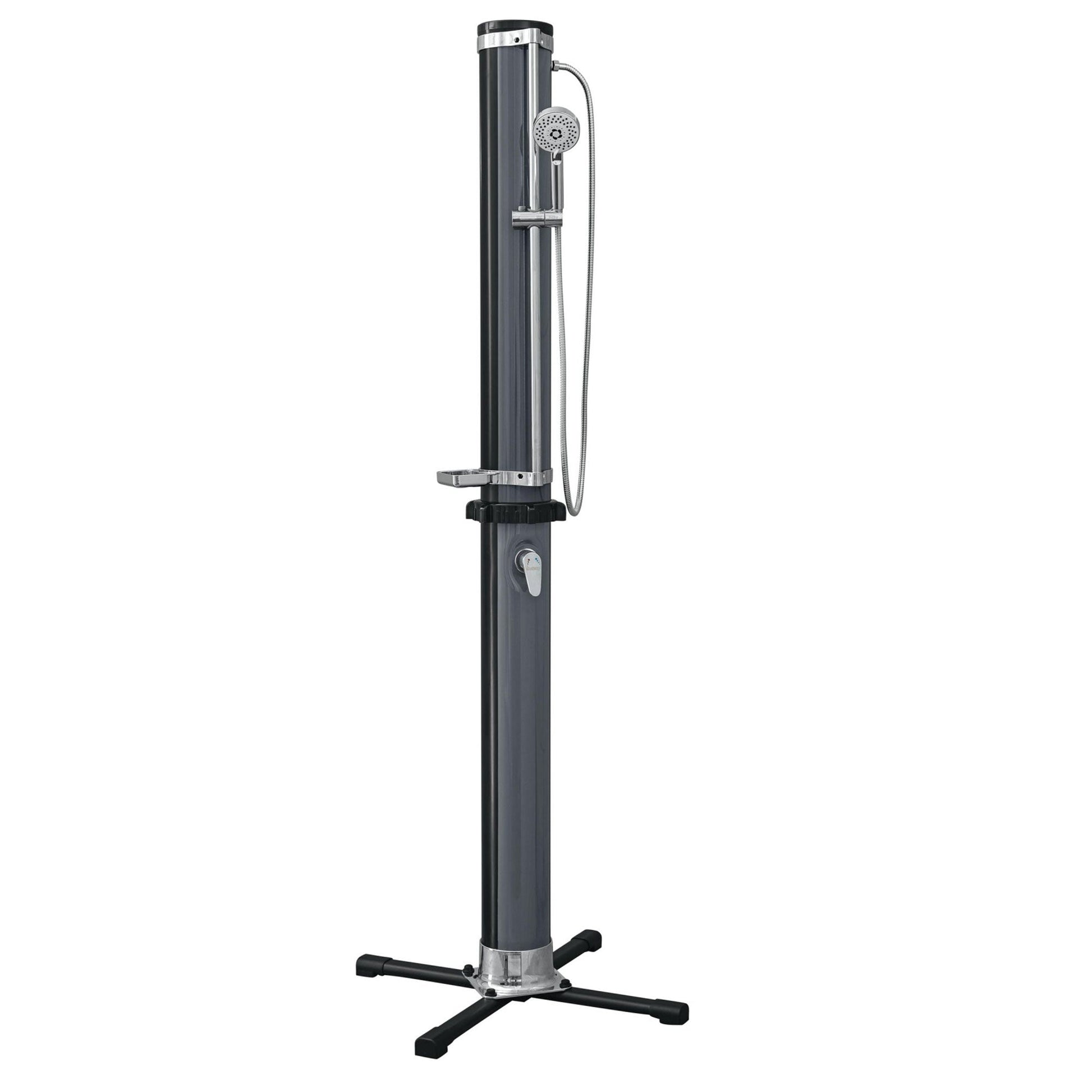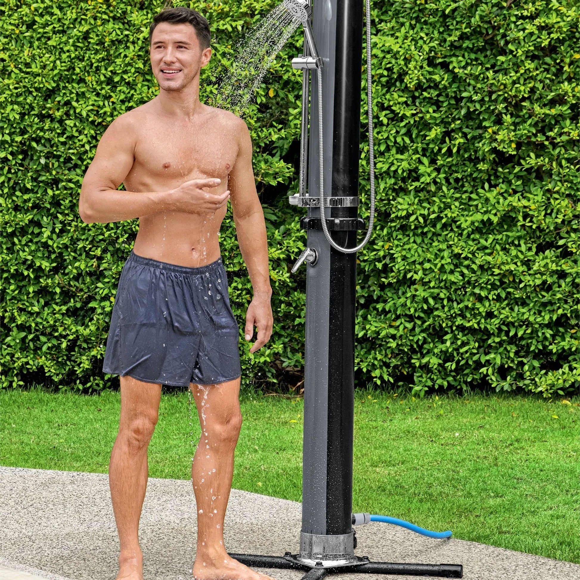 Ideal for pool owners, outdoor enthusiasts, beach volleyball players, and anyone who wants to shower after their outdoor activities, this convenient outdoor shower features an adjustable shower head that can tilt, move up and down, and be used fixed overhead or handheld. With multiple spray settings, including rain, pulse, jet, jet plus pulse, and rain plus pulse, this outdoor shower empowers you to customize your shower experience, ensuring an excellent cascade of water every time. From gentle rain-like droplets to powerful sprays, this outdoor shower has it all. Its quick connector, on the other hand, attaches to a standard garden hose (hose not included) to let the water flow and for effortless assembly. With its solar power system, this shower harnesses the power of the sun and warms up to 9.2 gallons of water, making each shower refreshingly invigorating. Meanwhile, the sturdy, weatherproof construction ensures durability, so you can enjoy countless outdoor showers for years to come.