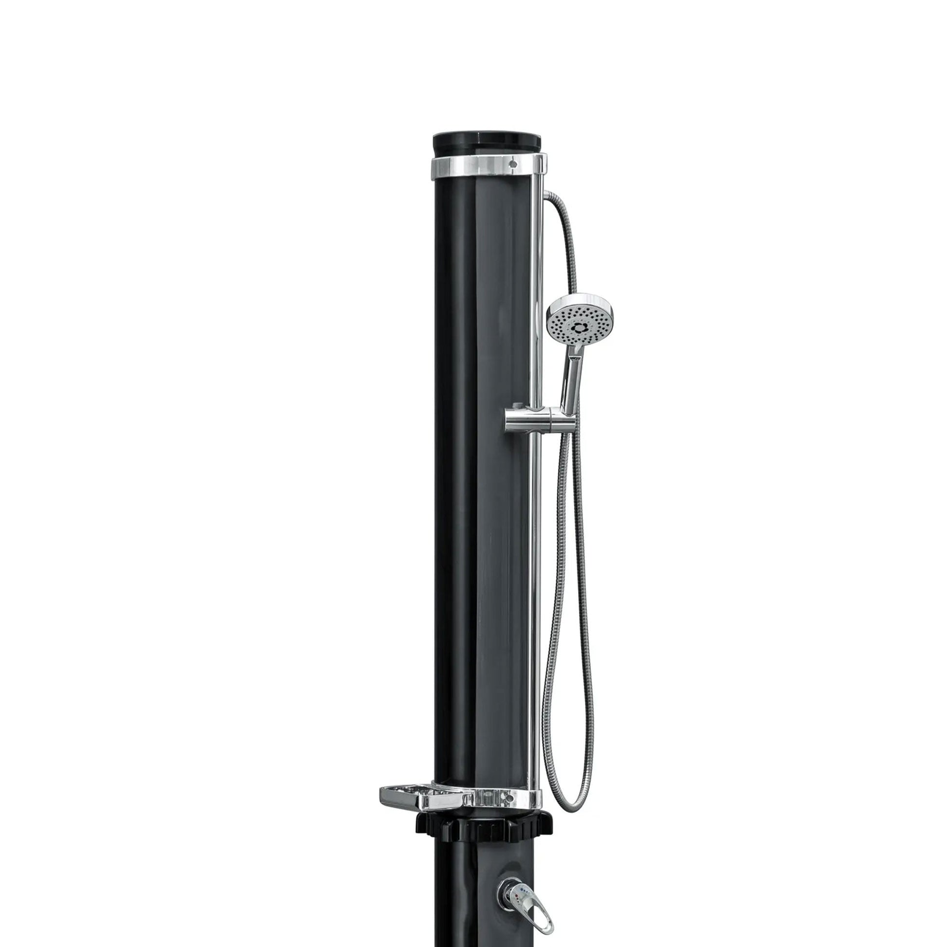 - Black and gray designed shower holds 9.2-gallon of water in the reservoir tank, which is warmed by the solar heating feature when left filled