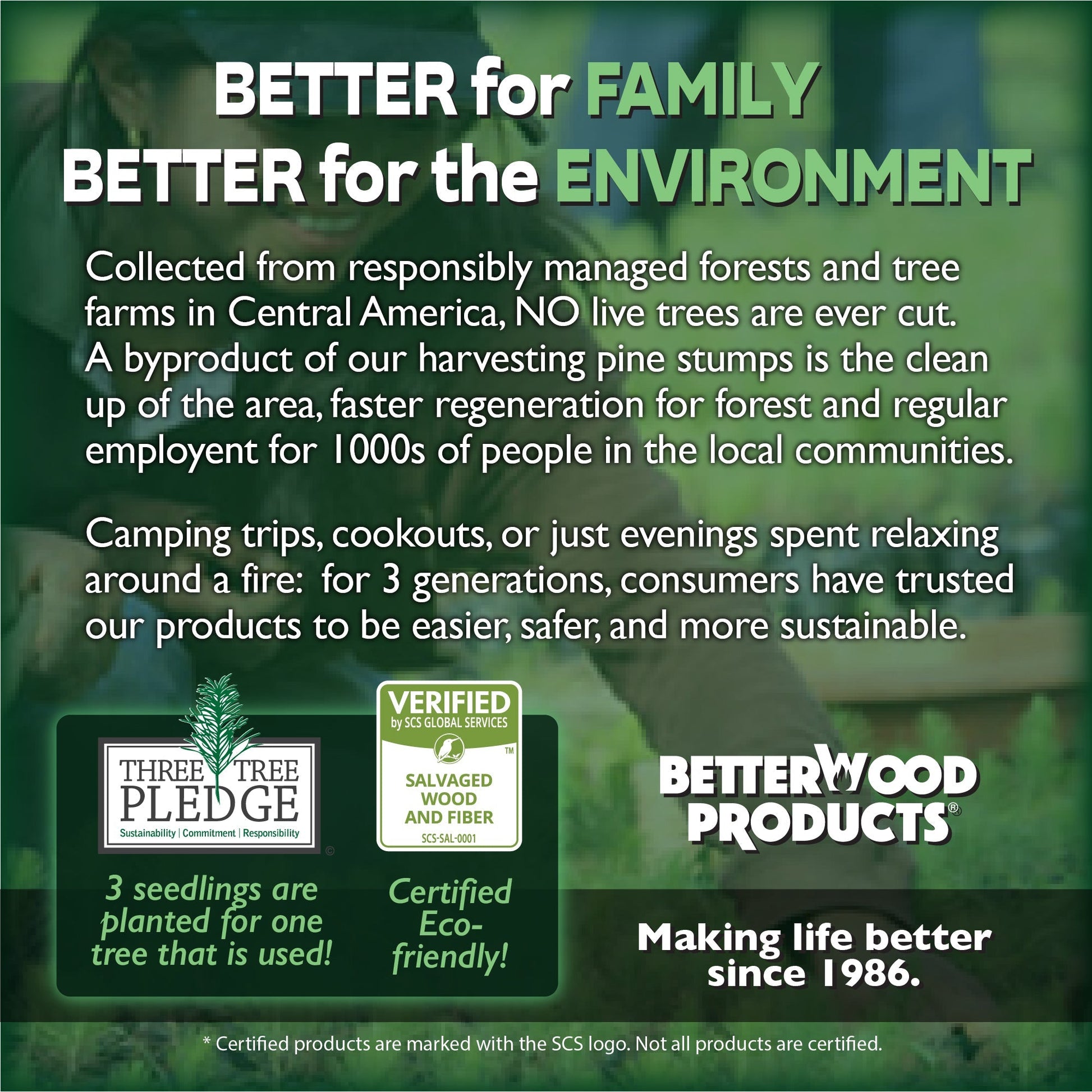 Fatwood fire starter sticks are 100-percent natural, made from resin found in the stumps of pine trees with no chemicals, or additives, providing a safer, simpler way to start any fire. These fire sticks start fast and burn hot, even when wet. Ideal for fireplaces, chimeneas, pellet stoves, and more, you can take this firewood wherever you go. Sustainability is of utmost importance, and the Three-Tree Pledge created by Better Wood Products plants 3 trees for every 1 that is harvested.