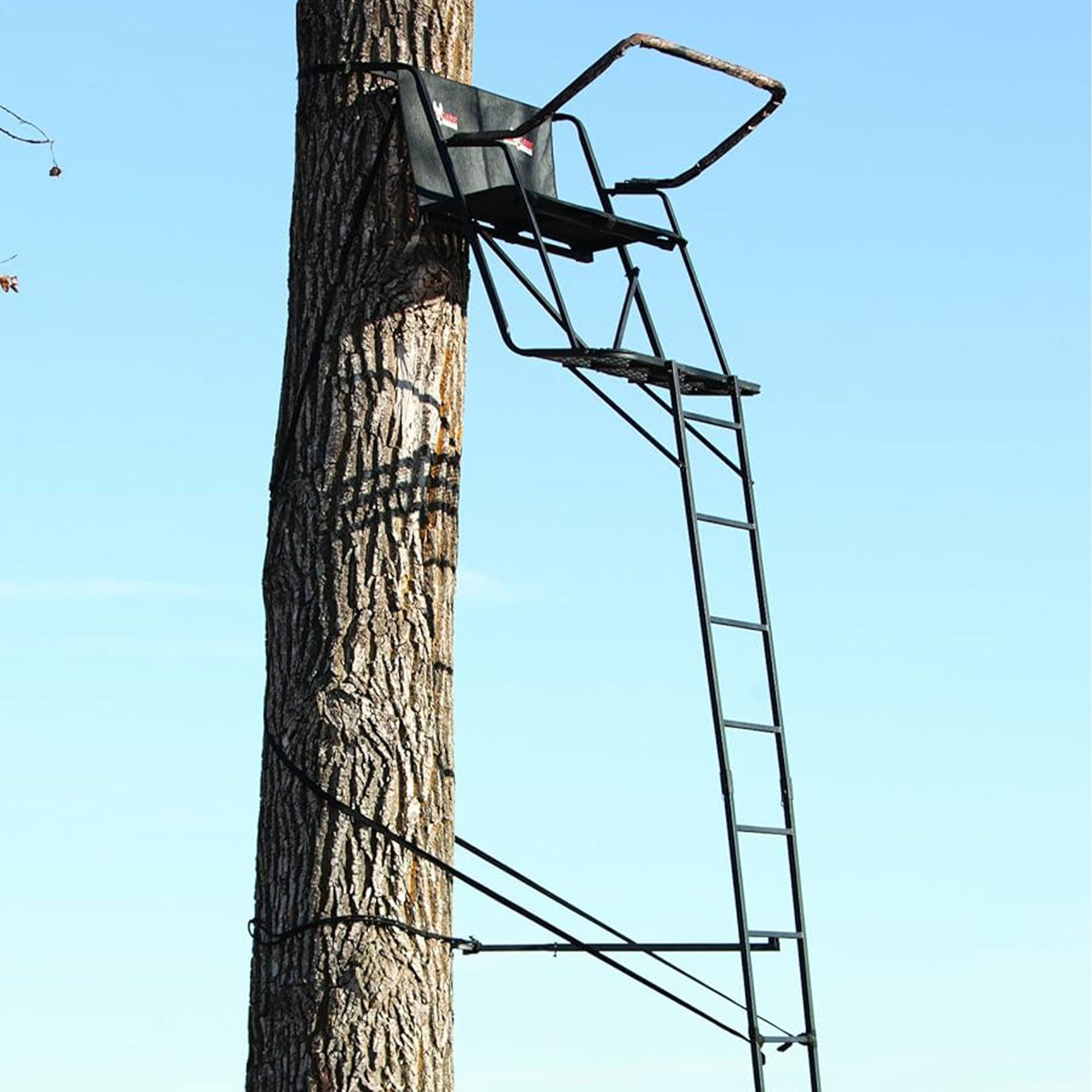 Built with durable steel materials with padded armrests and a padded shooting rail, this stand is the true balance of strength and comfort. The Flex-Tek contours to your back and legs and features a 360-degree rotation design, meaning you'll always have a good chance at the perfect shot. The ultra-strong construction of the ladder stand can support up to 600 pounds, so no need to hunt alone. Including the stand itself with an adjustable support bar, a 1-inch ratchet strap, and (2) 1-inch stabilizer straps, this piece of hunting equipment will set you up for an ideal day outdoors.