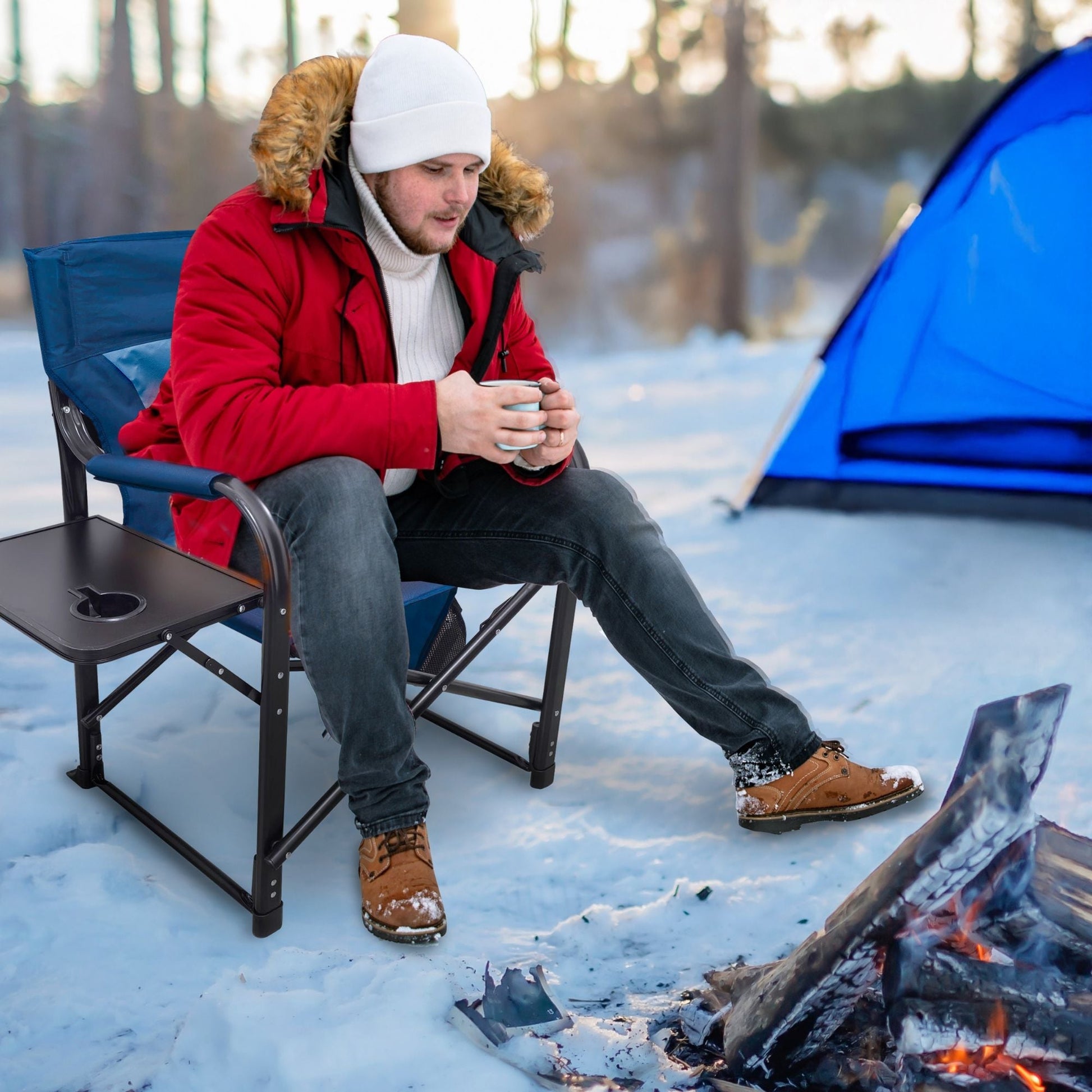 The chair also includes a collapsible steel frame for easy transport and storage, paired with a padded polyester seat and backrest for added comfort. A foldaway side tray table with a convenient cupholder lets you keep your drinks and snacks within reach, and when you need to get up for more refreshments, the auto power save feature turns off when you leave the chair for efficient battery use. Experience unmatched comfort, customizable heating, and stylish flair with your outdoor seating with Bliss Hammocks Heated Directors Seat. Find Your Bliss.
