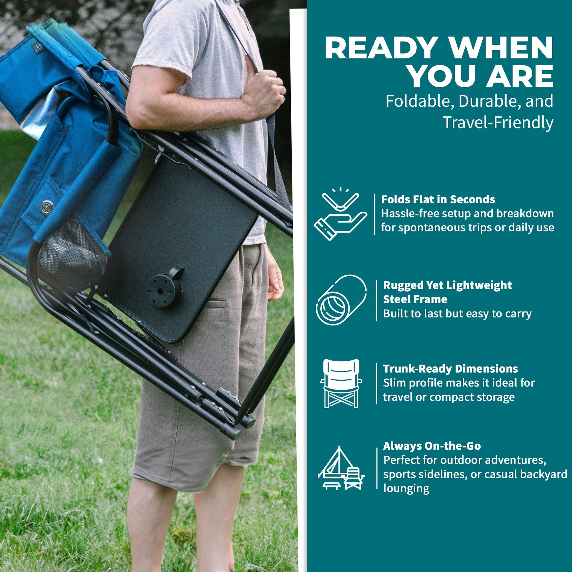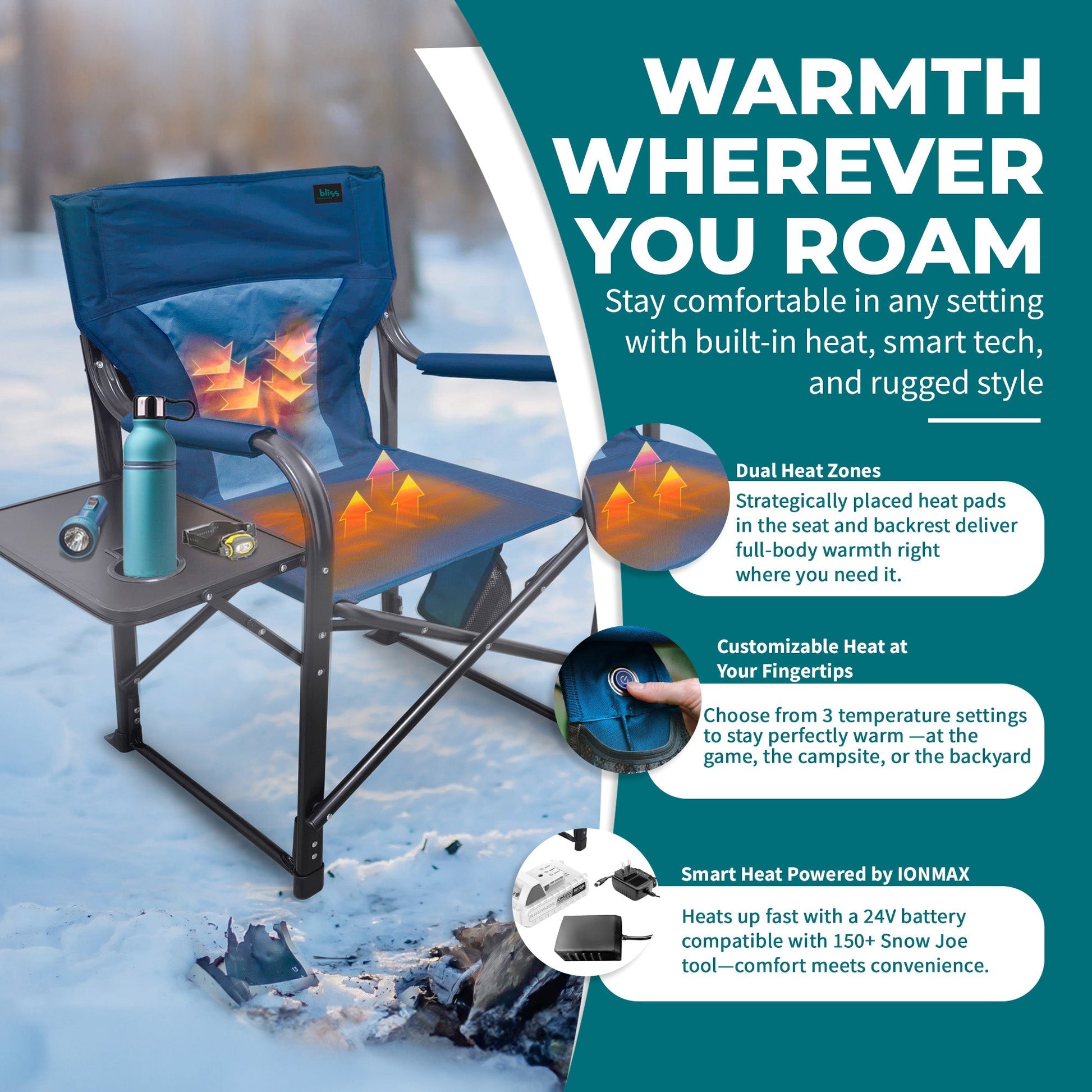 Bliss Hammocks 24V Heated Seat, Folding Chair w/Battery & 3 Heat Settings, Blue